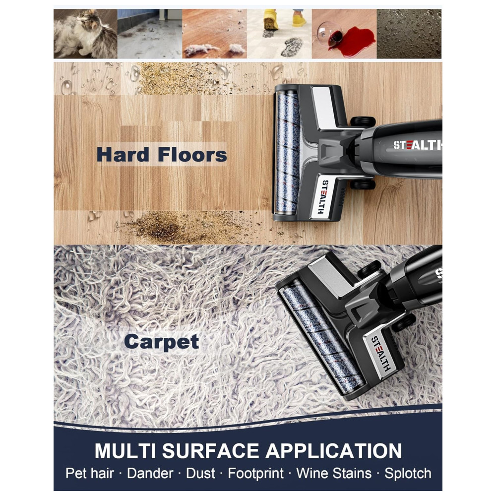 Limpeza Potente em Diversas Superfícies: Equipado com uma escova rotativa, o Stealth ECVP01 maneja sujeira em pisos de madeira, azulejos, cimento e outros pisos duros com facilidade, enquanto a escova específica para pisos duros se dedica a carpetes e tapetes. Desfrute da limpeza profunda de um aspirador vertical tradicional em um dispositivo moderno e eficiente.