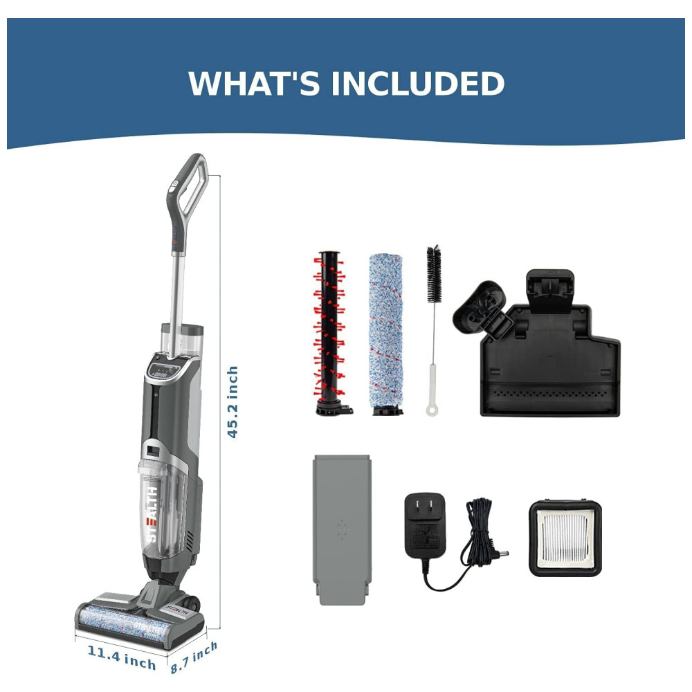 O Que Você Receberá: O pacote inclui o Aspirador e Esfregão, escovas rotativas e para pisos duros, bateria de 2600mAh, adaptador universal, estação de acoplamento, bandeja seca, filtro HEPA com escova de limpeza, kit de limpeza completo e manual do usuário.