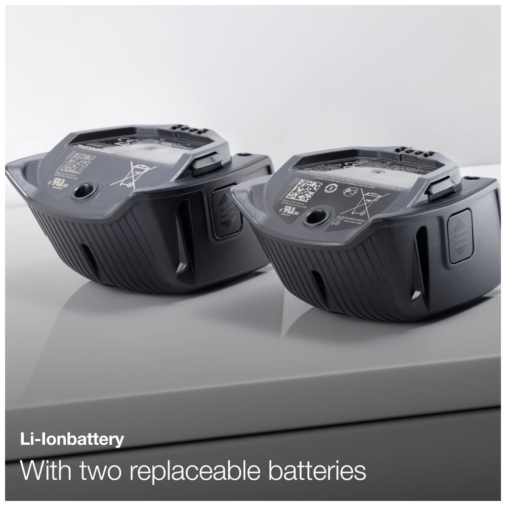 Até 120 min de tempo de execução: 2 baterias substituíveis VARTA Li-ion de 25V, para limpar grandes áreas sem interrupção; completo com suporte de acessório adicional