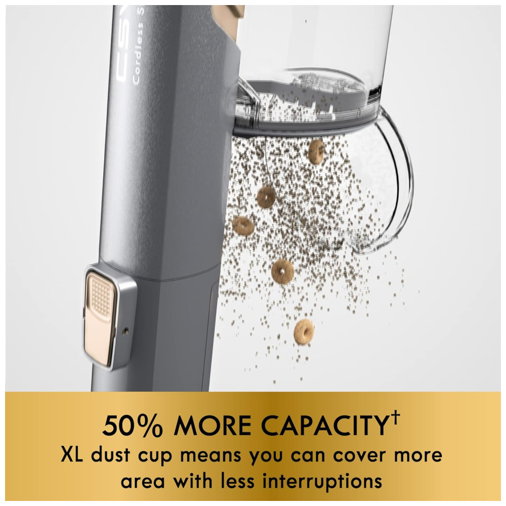 Este modelo oferece 50% mais capacidade com um copo de pó extragrande, permitindo cobrir mais área de limpeza sem a necessidade de esvaziá-lo frequentemente. Além disso, pesando menos de 2,7 kg no total e menos de 1,36 kg em sua configuração como aspirador de mão, é perfeito para limpezas acima do solo ou para transportar facilmente escada acima e abaixo.