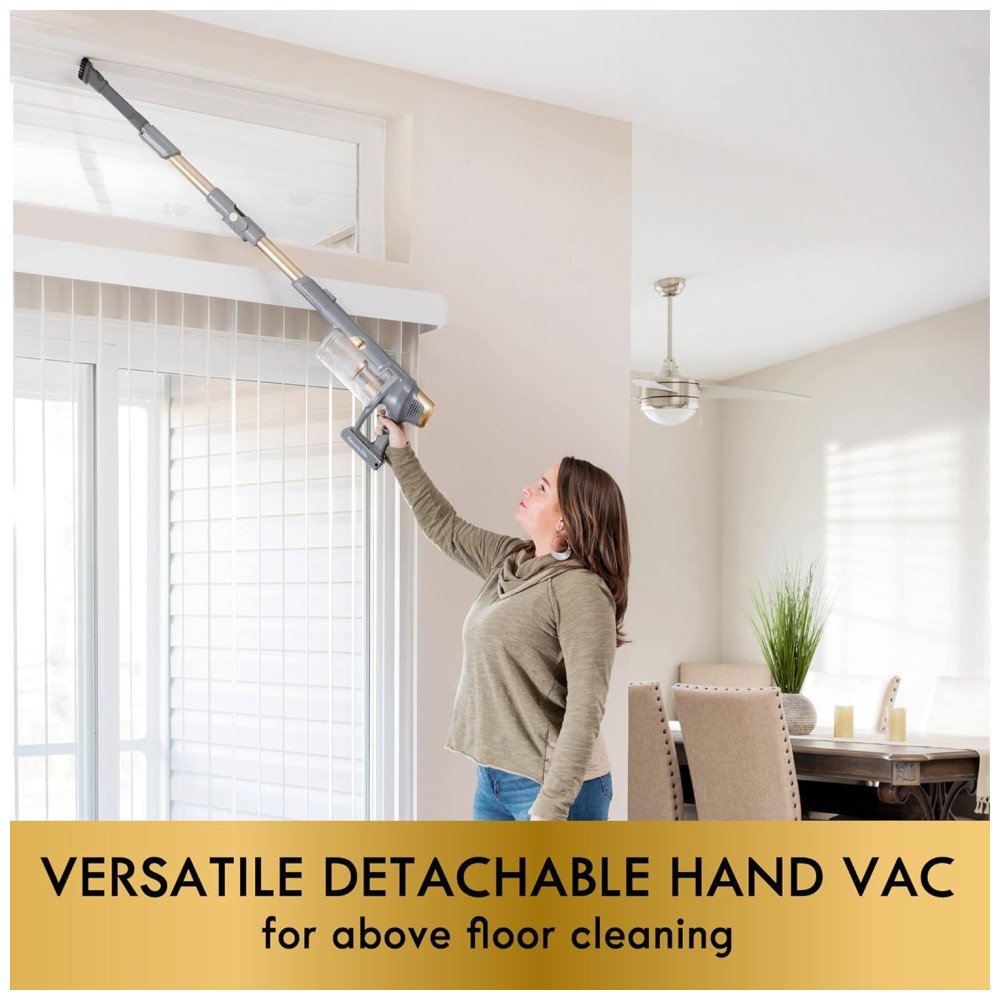 A Vara EasyReach flexível permite limpar embaixo dos móveis com apenas o toque de um botão, tornando os cantos mais difíceis acessíveis. O motor sem escovas de 250W fornece uma potência de sucção de até 17 Kpa no modo turbo, ideal para todos os tipos de piso, incluindo superfícies duras, carpetes e estofados.