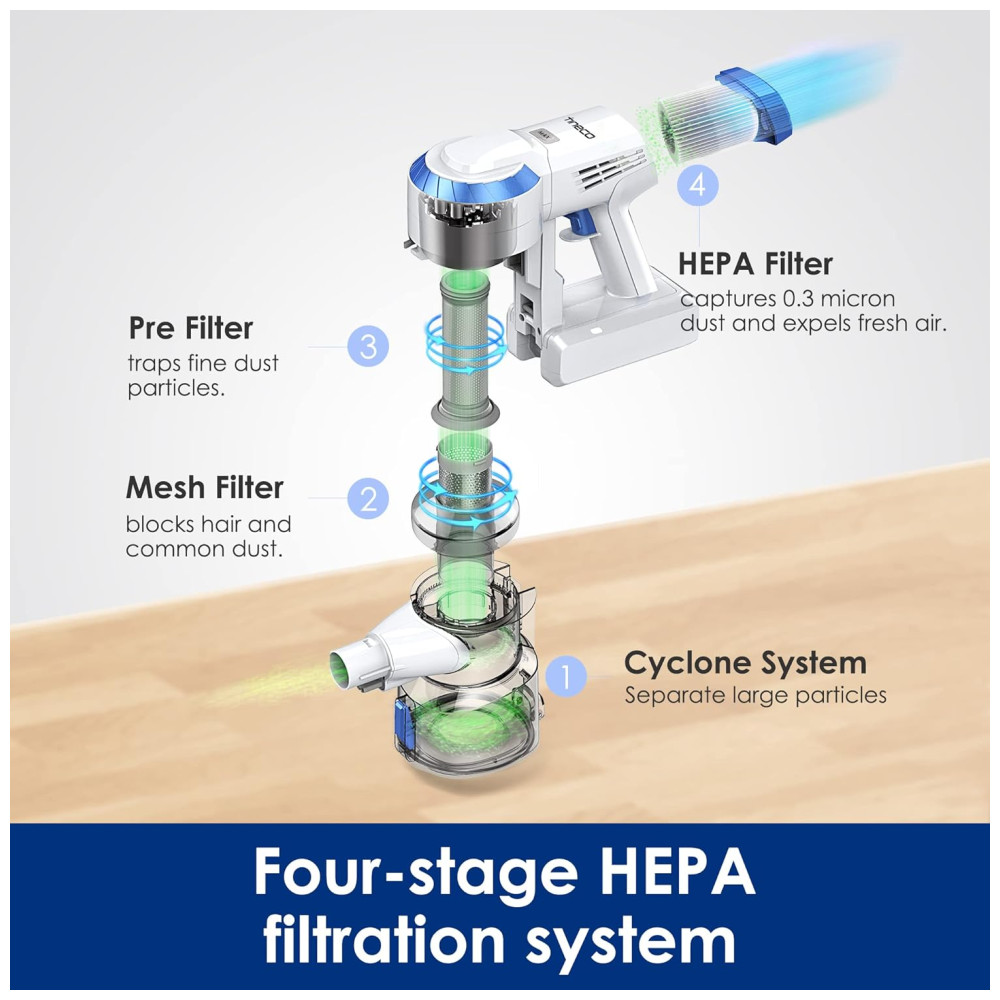 Expulsão de Ar Fresco Apenas: Sistema de filtragem e ciclônico de 4 estágios totalmente selado, que captura 99,9% das partículas tão pequenas quanto 0,3 mícrons, proporcionando ar mais limpo para o seu ambiente doméstico ou de escritório.