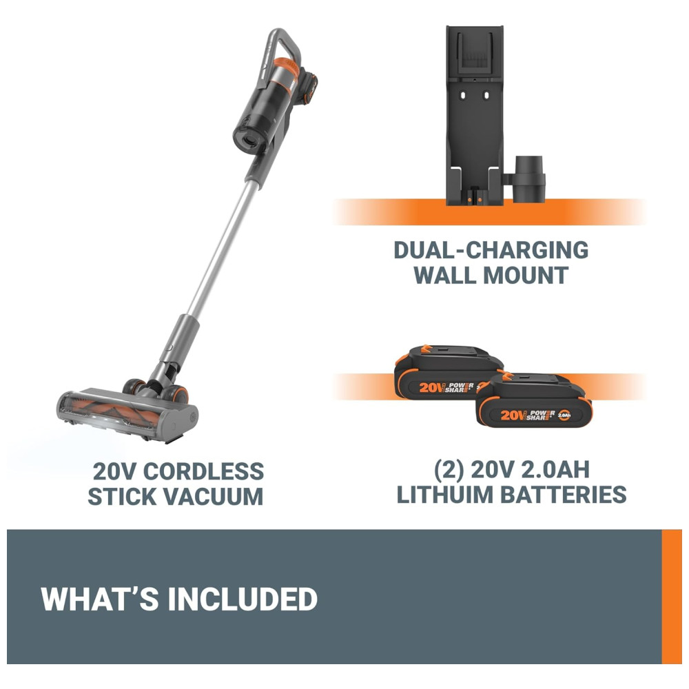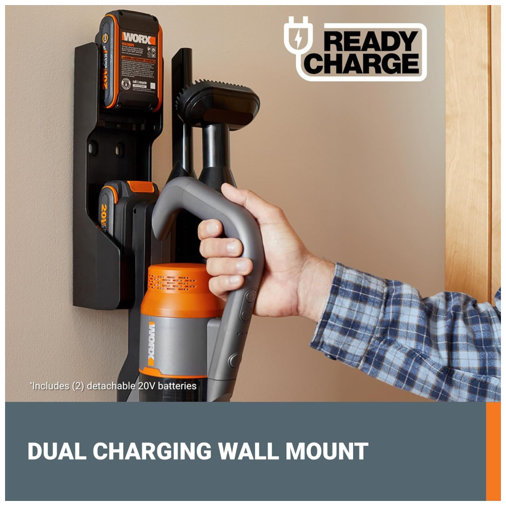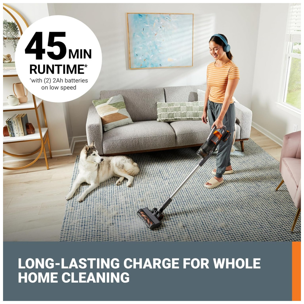 Componentes Incluídos: Aspirador de pó sem fio de 20 V, 1 ferramenta para fendas, 1 escova de pó, 1 escova de cabelo para animais de estimação, 1 filtro extra, 2 baterias de 20 V 2,0 Ah, 1 suporte de parede com carregamento duplo