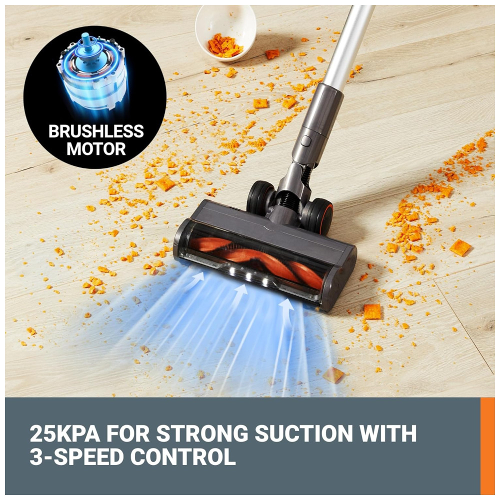 Este versátil aspirador sem fio pode ser utilizado em diversas superfícies, incluindo carpetes, estofados, madeira, azulejos, escadas, carros e muito mais. Além disso, as luzes LED integradas iluminam espaços escuros, garantindo que nenhuma sujeira ou poeira passe despercebida.
