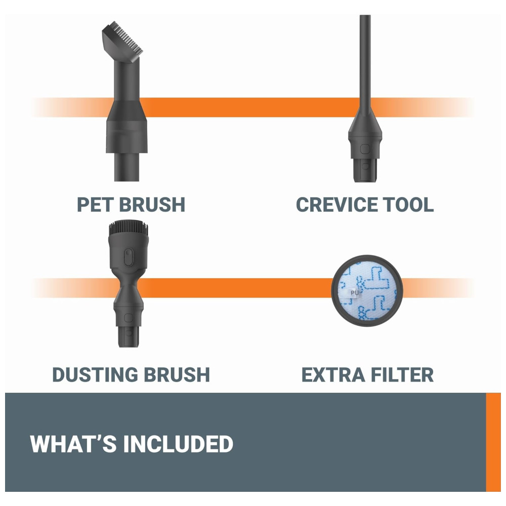 Este aspirador portátil vem com acessórios versáteis que facilitam a realização de outras tarefas de limpeza. A escova de pêlos para animais de estimação remove pêlos sem esforço com cerdas de borracha que prendem os pêlos facilmente. A ferramenta para fendas e a escova para pó ajudam a alcançar áreas difíceis. Incluímos até um filtro extra para sua conveniência.