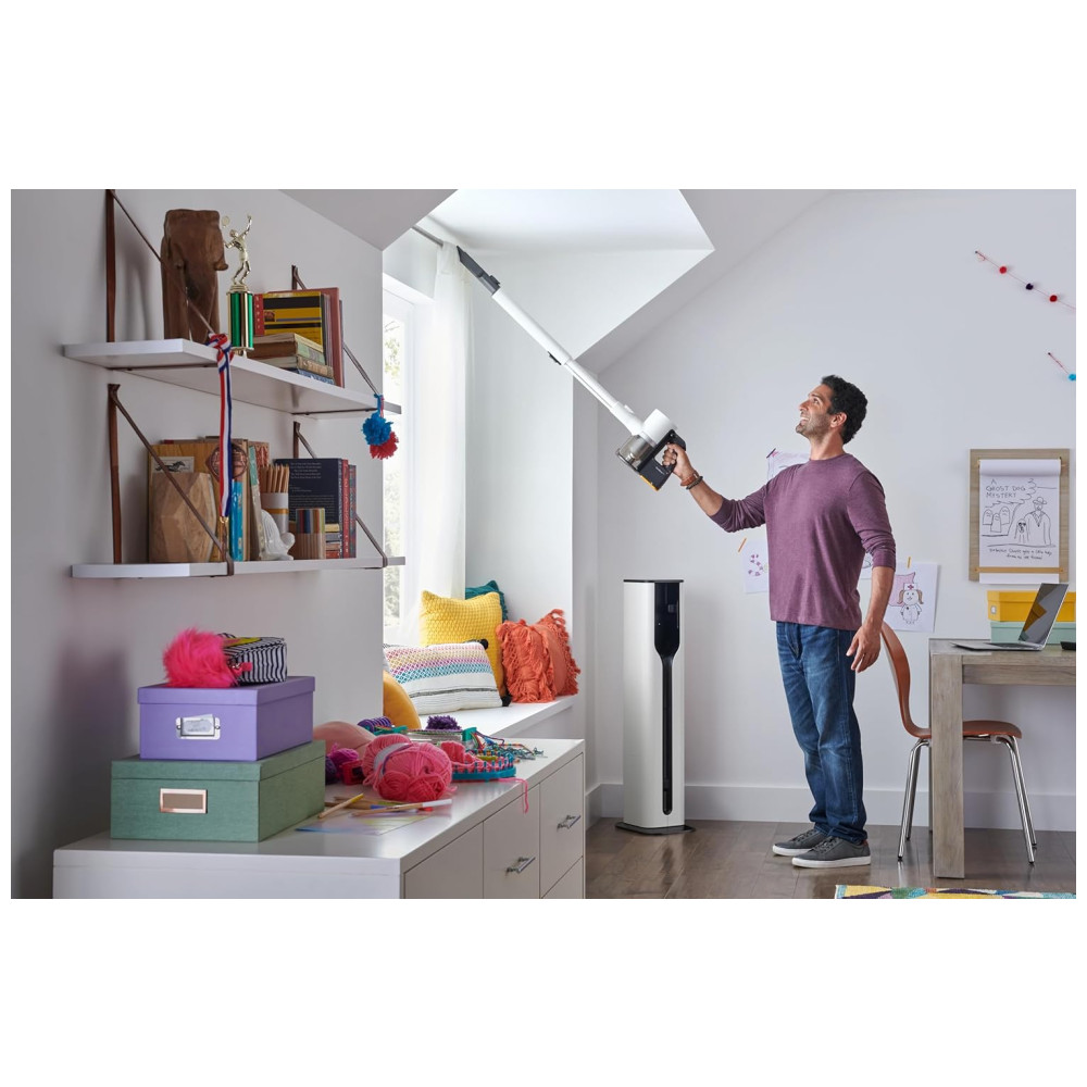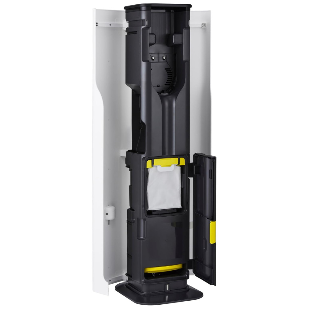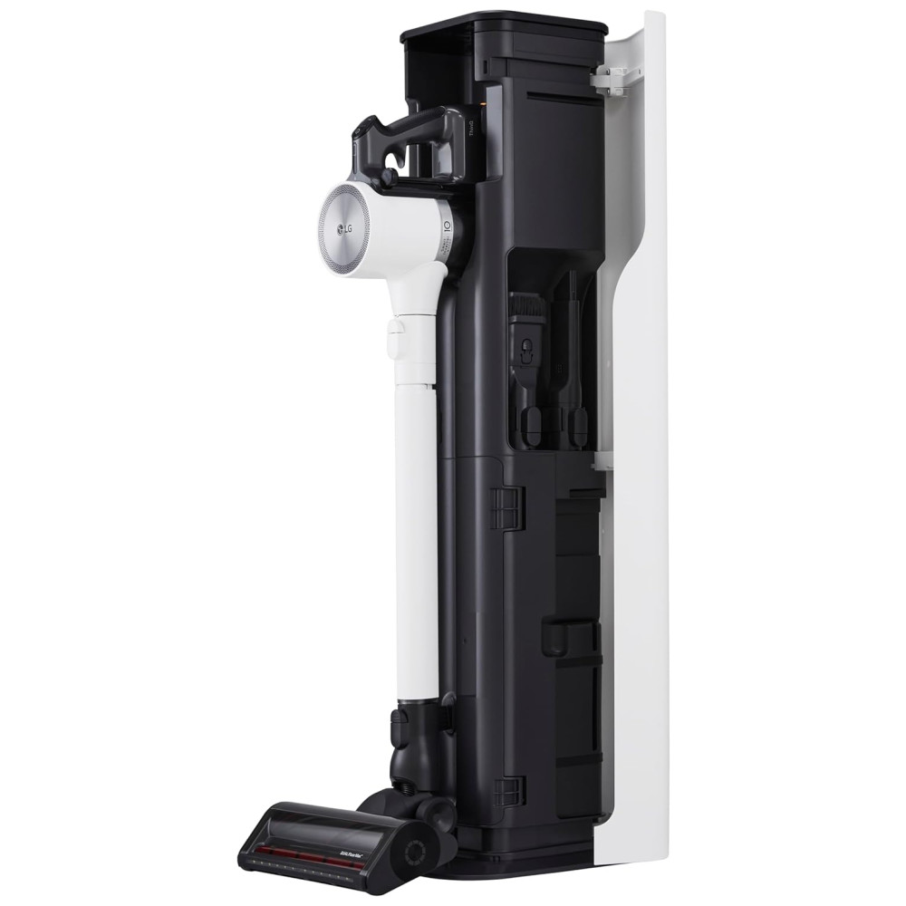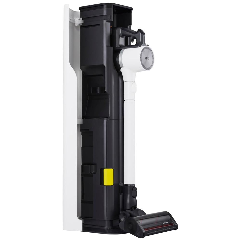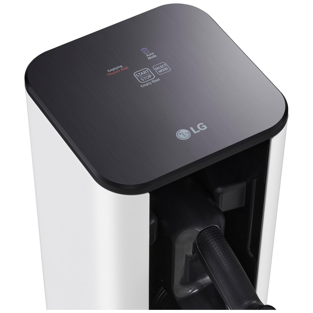 O design elegante e atrativo mantém o aspirador e as ferramentas da LG enquanto carrega a bateria e esvazia automaticamente o compartimento de detritos.