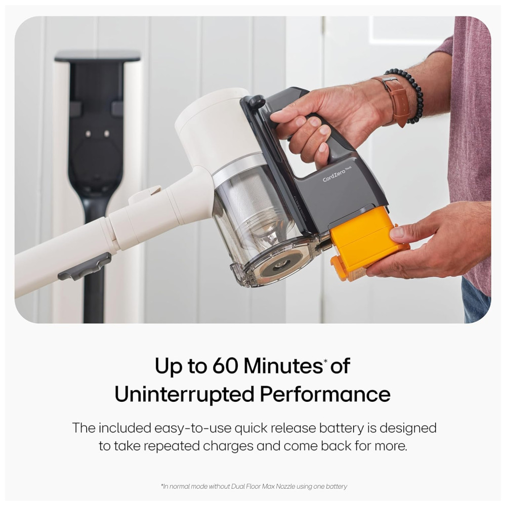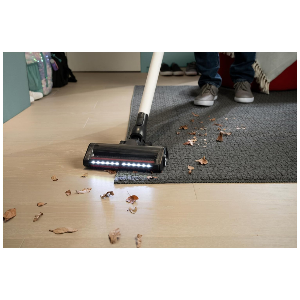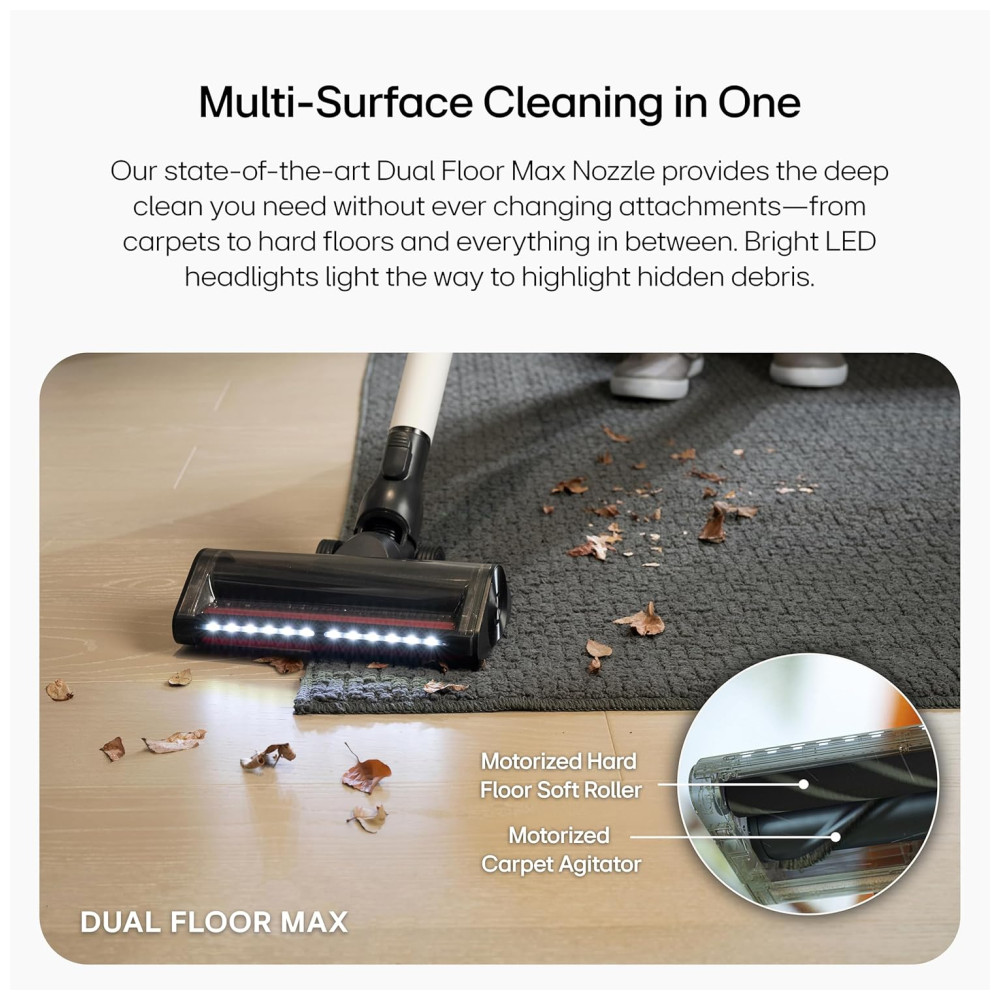 O novo bocal Dual Floor Max combina um rolo macio e um agitador para carpetes, proporcionando uma limpeza potente e fácil em carpetes e pisos duros. Oferece conveniência em diversas superfícies, acompanhado de um farol LED integrado para que sujeira, poeira e detritos não tenham onde se esconder.