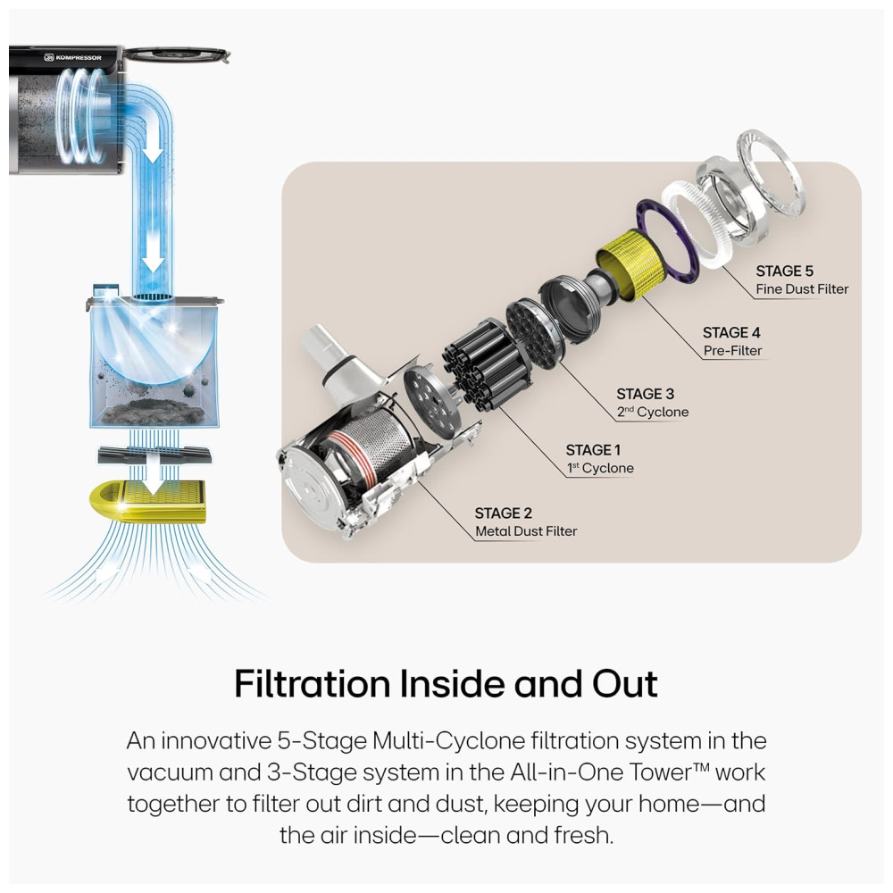 O sistema de 5 etapas filtra eficientemente poeira e sujeira, começando por separar os resíduos no compartimento e depois filtrando a poeira fina.