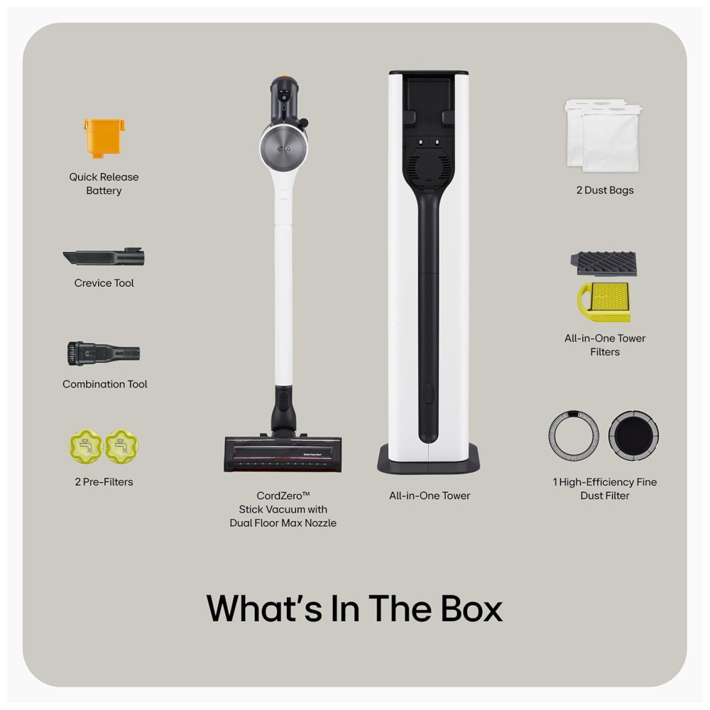 – Recurso especial: Esvaziamento automático, novo bocal máximo de piso duplo, controle de um toque, varinha telescópica, recipiente de pó de alta capacidade com tecnologia Kompressor, filtros laváveis e ciclone, filtragem de 5 etapas no vácuo, filtragem de 3 etapas em Torre tudo em um, Wi-Fi integrado para aplicativo LG ThinQ, torre tudo em um com armazenamento de acessórios para ferramentas, bateria recarregável de liberação rápida, aspirador portátil removível