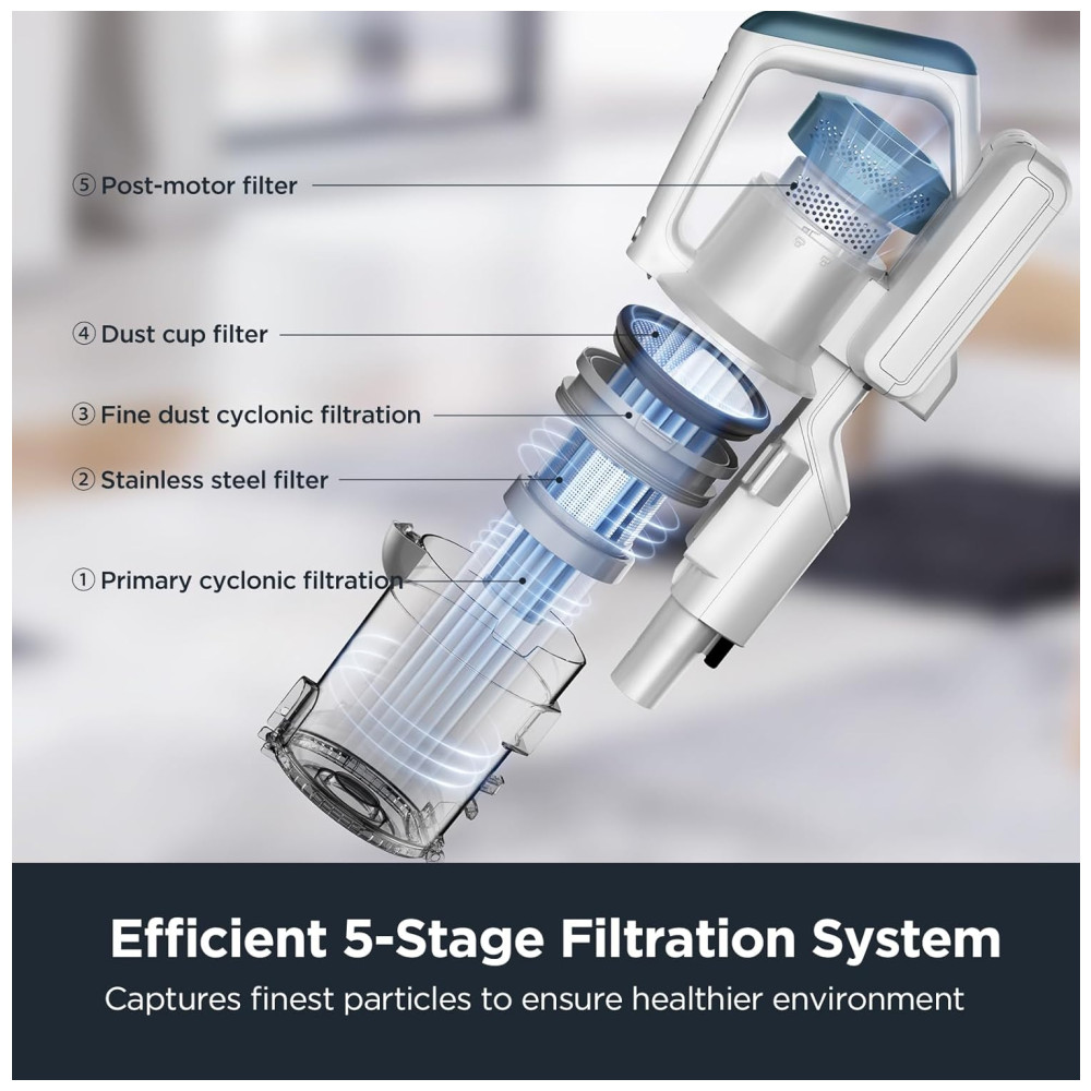 Diga adeus aos aspiradores volumosos e dê as boas-vindas ao Eureka RapidClean Pro NEC280TL, a sua solução leve e sem fio para uma casa impecável. Com um motor sem escovas de 250W aprimorado, este aspirador oferece uma sucção excepcional que levanta sujeira, detritos e pelos de animais de todos os tipos de piso. Com até 40 minutos de autonomia, graças à bateria de íon de lítio de 25,2V, você pode limpar mais sem precisar recarregar. Três modos de limpeza personalizados permitem uma experiência de limpeza sob medida, garantindo um desempenho ideal em todas as superfícies. Os faróis de LED embutidos revelam sujeiras em áreas de difícil acesso, garantindo uma limpeza minuciosa a cada uso. Além disso, o sistema de filtração de 5 estágios captura partículas finas e alérgenos, promovendo um ambiente de vida mais limpo e saudável. Com peso de apenas 2,4 kg e rotação de 180 graus, este aspirador oferece uma manobrabilidade sem esforço ao redor de móveis e espaços apertados. Com o motor digital sem escovas de 250W, este aspirador oferece 240% mais poder de sucção em comparação com modelos anteriores, garantindo uma limpeza profunda em diversas superfícies.