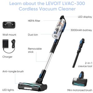 Aspirador de Pó Sem Fio LEVOIT com Filtro HEPA Design Antienrosco Autonomia de 60 Min Sucção Poderosa Leve Escova Motorizada Mini para Carpete