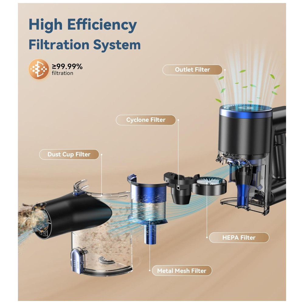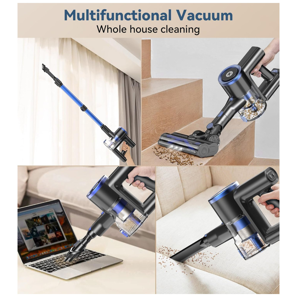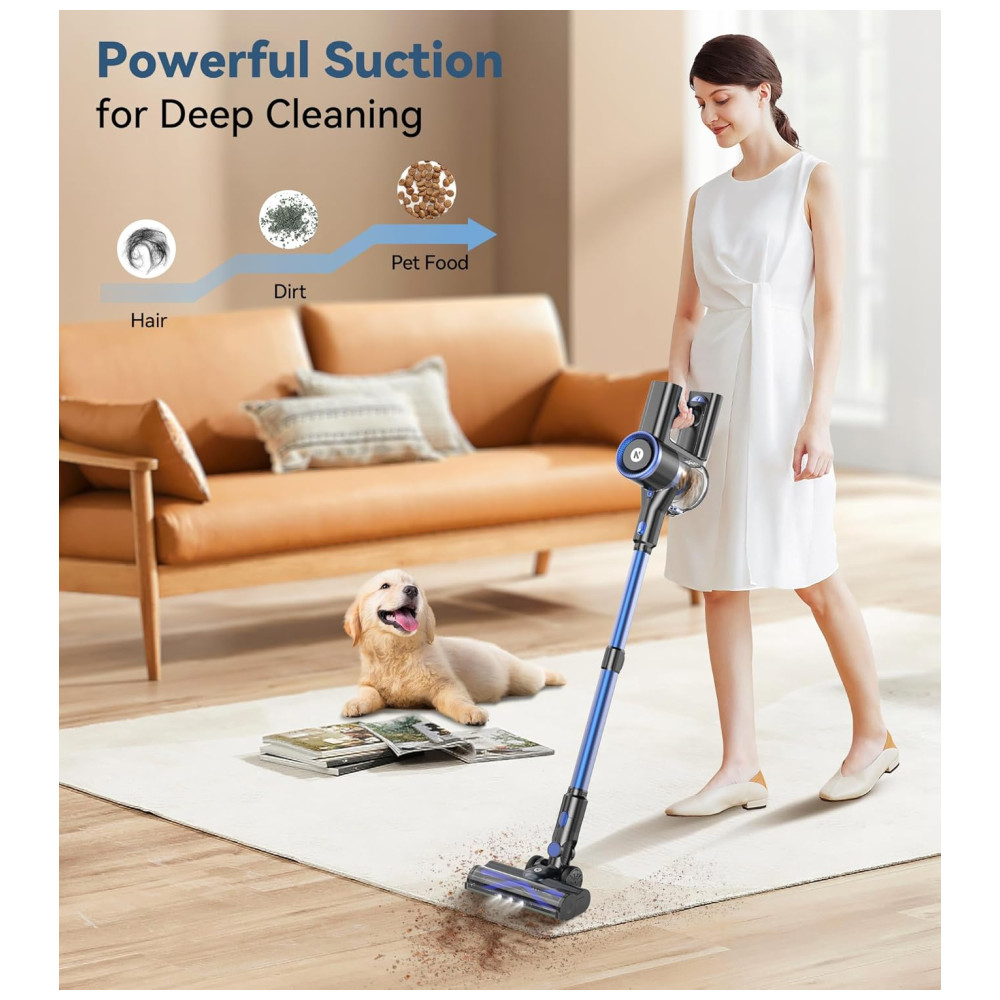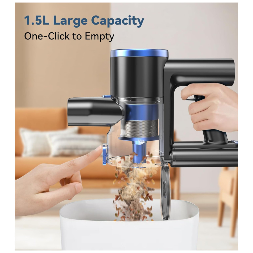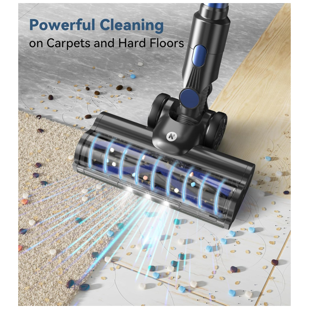 O Aspirador de Pó Sem Fio da NADALY oferece 3 modos de sucção poderosos, incluindo um modo máximo com sucção de 28Kpa, permitindo a remoção fácil de migalhas, poeira, pelos de animais, areia para gatos e outras sujeiras em diversas superfícies. Com uma bateria de longa duração de até 45 minutos, você pode limpar toda a casa profundamente sem interrupções. A escova flexível antienrolamento com faróis de LED permite uma limpeza eficiente, sem deixar nenhum canto escuro. Leve e multifuncional, este aspirador é fácil de usar por longos períodos sem causar fadiga, e pode ser transformado em um aspirador de mão para limpeza detalhada de cortinas, camas, sofás e espaços difíceis de alcançar. Além disso, possui um sistema de filtragem de alta eficiência com filtro HEPA lavável, que captura até 99,99% das partículas pequenas, proporcionando ar fresco para você e sua família. Com capacidade para 1,5 litros, o coletor de pó grande reduz a frequência de esvaziamento.