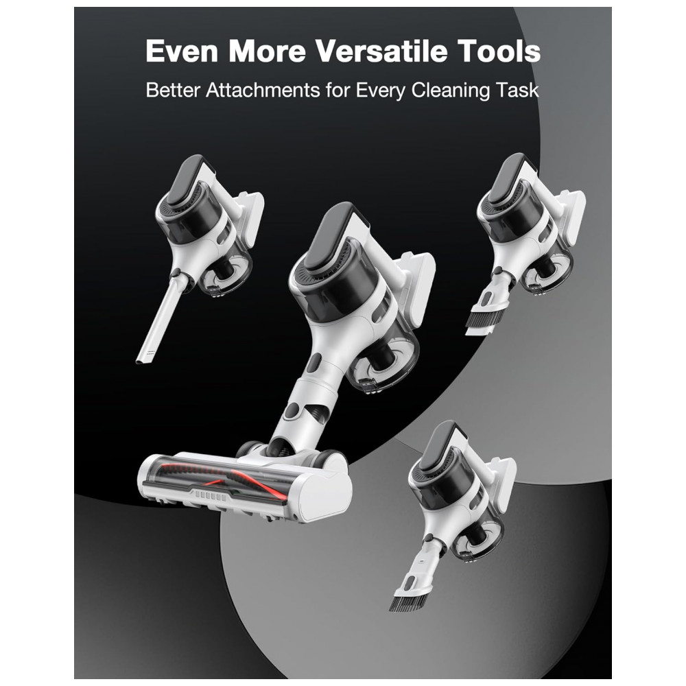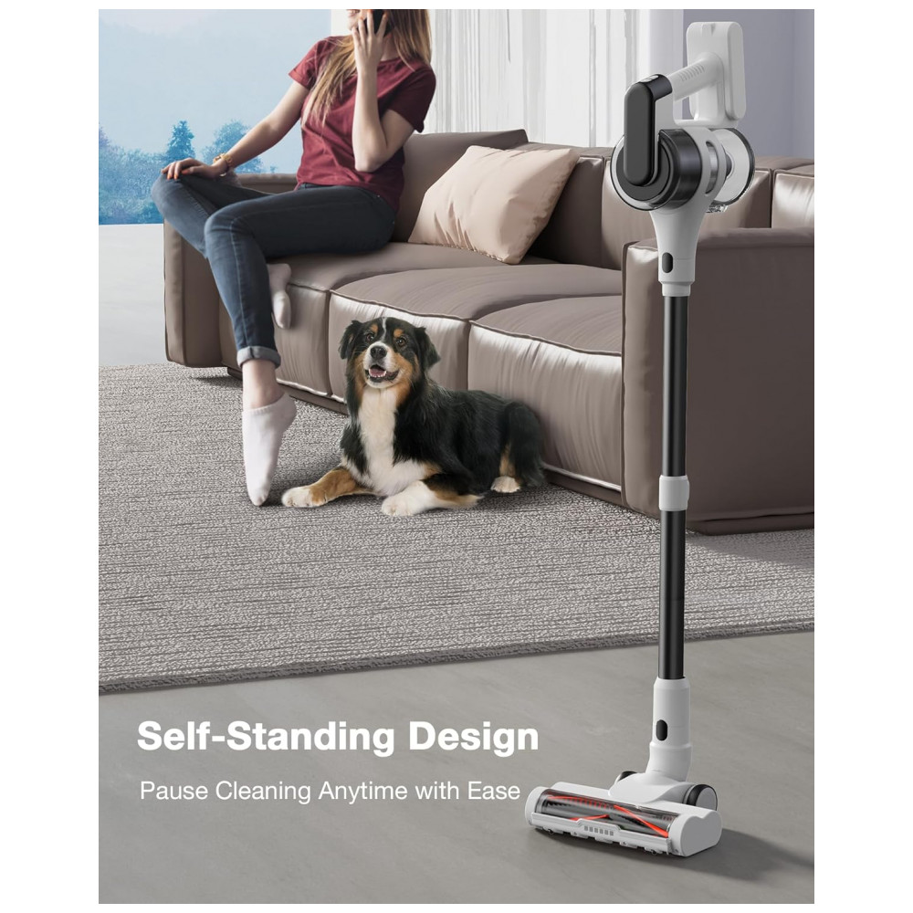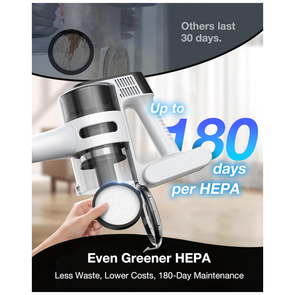 Característica Especial: Aspirador de Pó Sem Fio Motor aprimorado de 2025 com sucção de 20KPa Até 55 minutos de autonomia Armazenamento na parede Tubo de extensão ajustável Escova de Limpeza Profunda Filtração HEPA Recipiente de poeira de 1L Luzes LED verdes Modo silencioso de 70 dB Leve e multifuncional