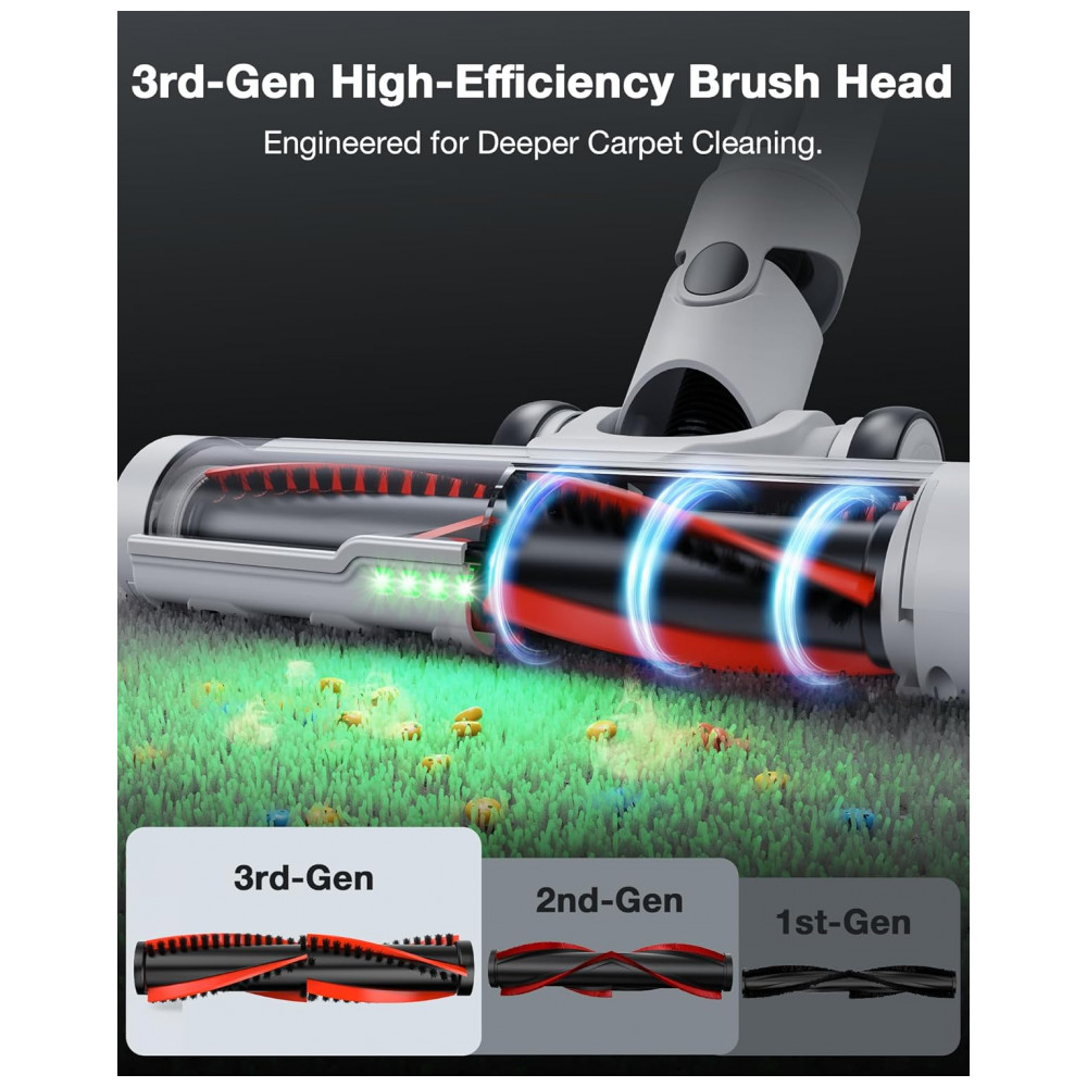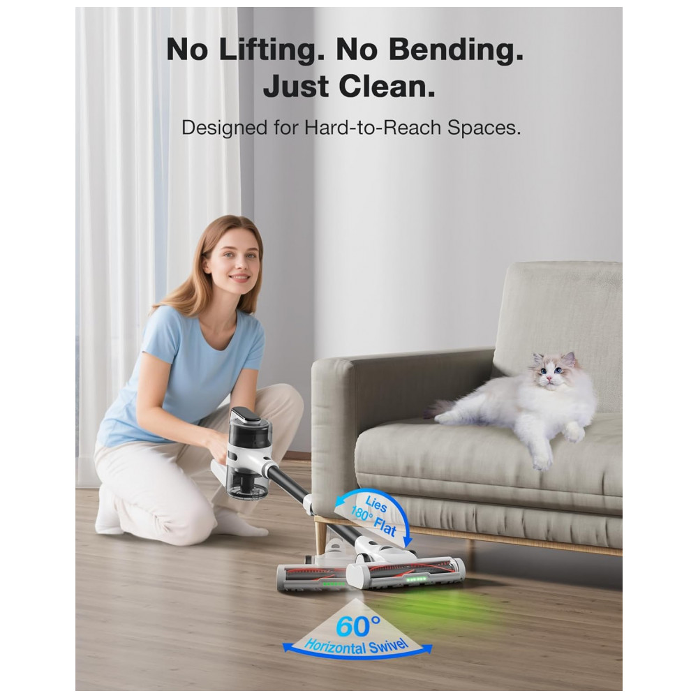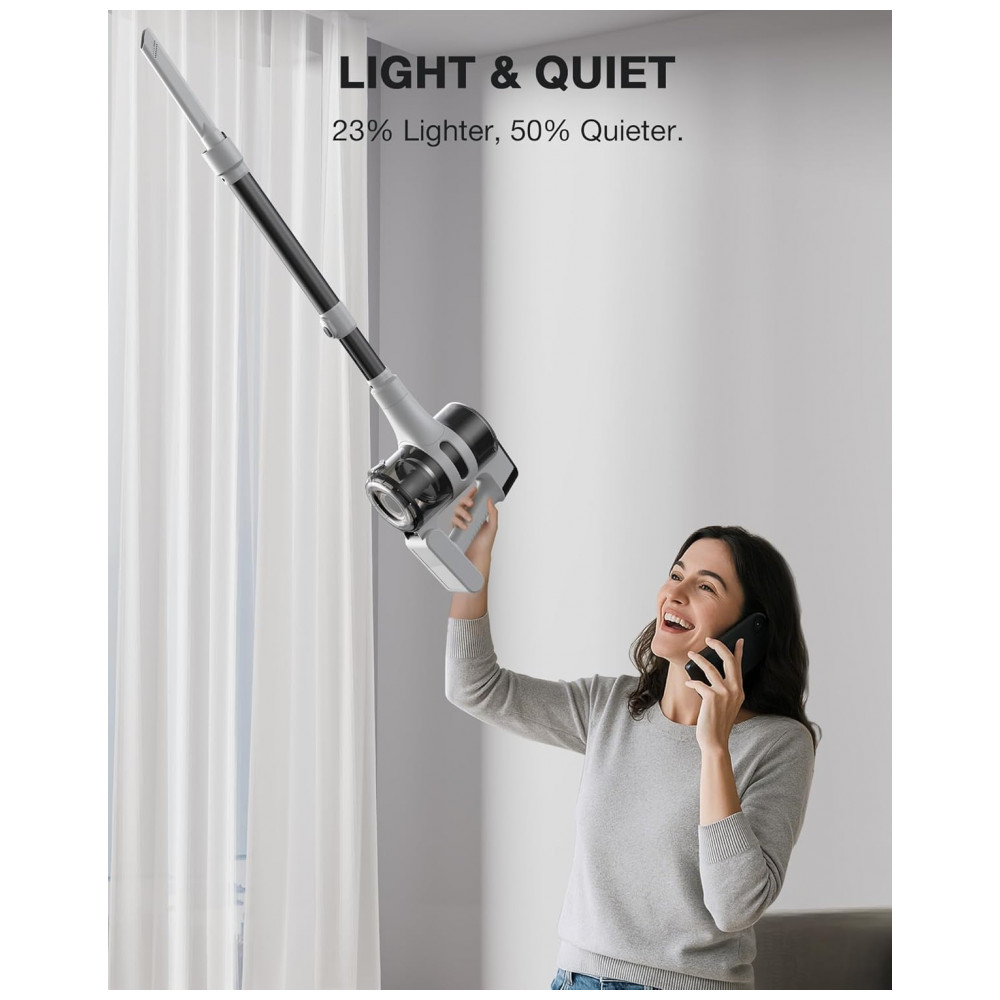 Deslize facilmente pelos cômodos com um aspirador de pó sem fio que é 30% mais leve que os modelos tradicionais. Ideal para uso diário, limpezas rápidas e alcançar locais altos ou estreitos com facilidade. Limpe mais, recarregue menos. Este aspirador recarregável oferece até 55 minutos de autonomia, o suficiente para cobrir até 139 metros quadrados de uma só vez. Perfeito para casas movimentadas e limpeza profunda em diferentes superfícies. Com potência de sucção de 20Kpa, ele remove sujeira, detritos e pelos de animais de estimação de carpetes e pisos de madeira. O design autônomo permite que você pause a limpeza a qualquer momento, enquanto a construção sem fio garante manobrabilidade. O rolo escovado atualizado combina cerdas rígidas e tiras de silicone para uma limpeza completa. Um amplo feixe de luz verde ilumina a poeira embaixo dos móveis e nos cantos escuros para que nada escape da sua limpeza. Economize tempo e reduza o desperdício com um filtro HEPA lavável por até 180 dias e um recipiente de poeira de 1L que precisa ser esvaziado com menos frequência. O armazenamento na parede com carregamento embutido mantém este aspirador sem fio pronto para uso.