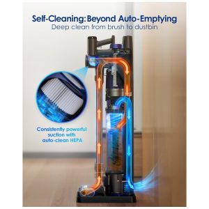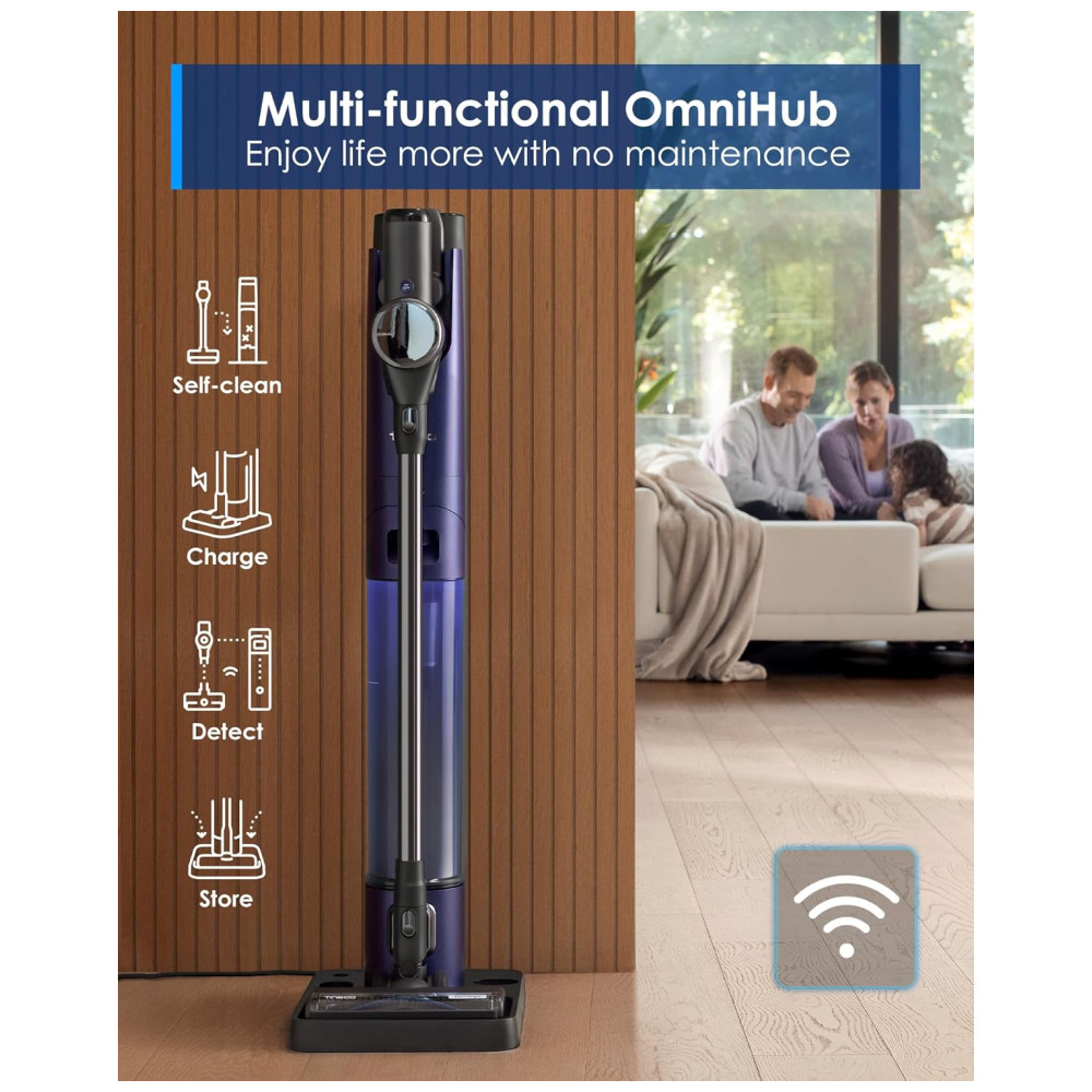 OmniHub multifuncional 4 em 1 redefine a experiência de limpeza doméstica. Após cada sessão de limpeza, basta devolver o aspirador ao OmniHub, onde ele se autolimpará, recarregará e armazenará automaticamente, fornecendo detecção em tempo real para manter sua casa sempre limpa.