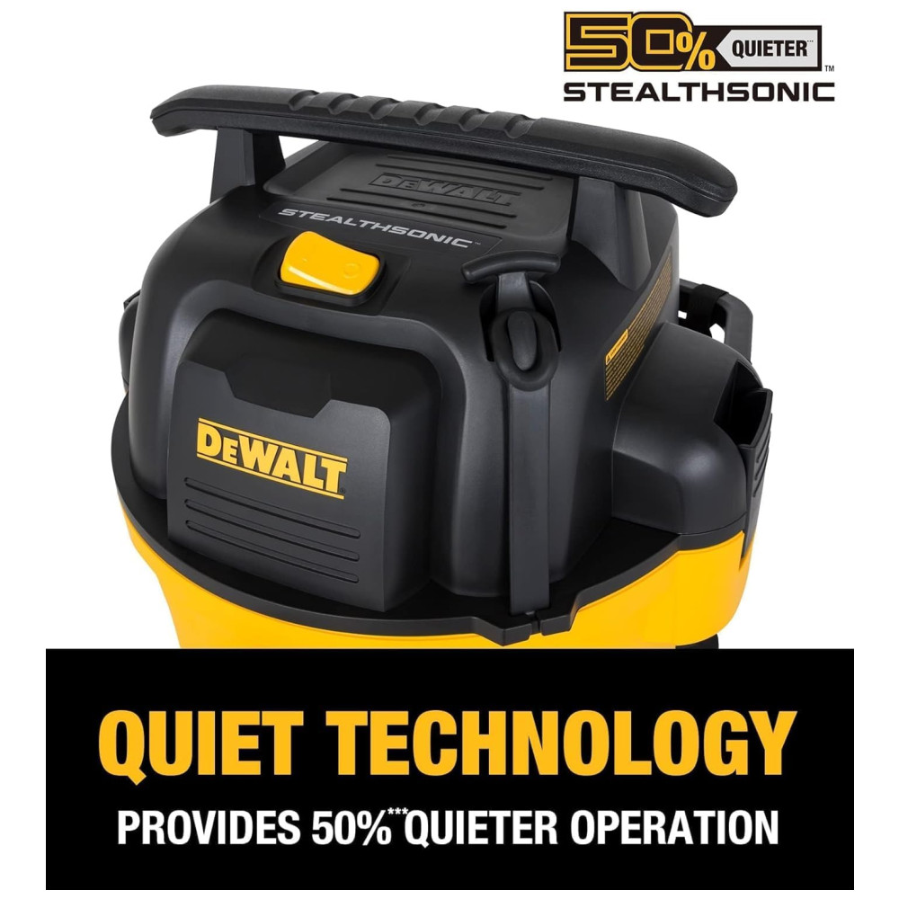 Nova tecnologia silenciosa: O aspirador poliúmido/seco DEWALT DXV09P-QTA de 34 litros possui um motor potente e silencioso que proporciona forte poder de sucção e fluxo de ar para limpar os detritos úmidos e secos mais difíceis, ao mesmo tempo em que é 50% mais silencioso que o modelo atual.