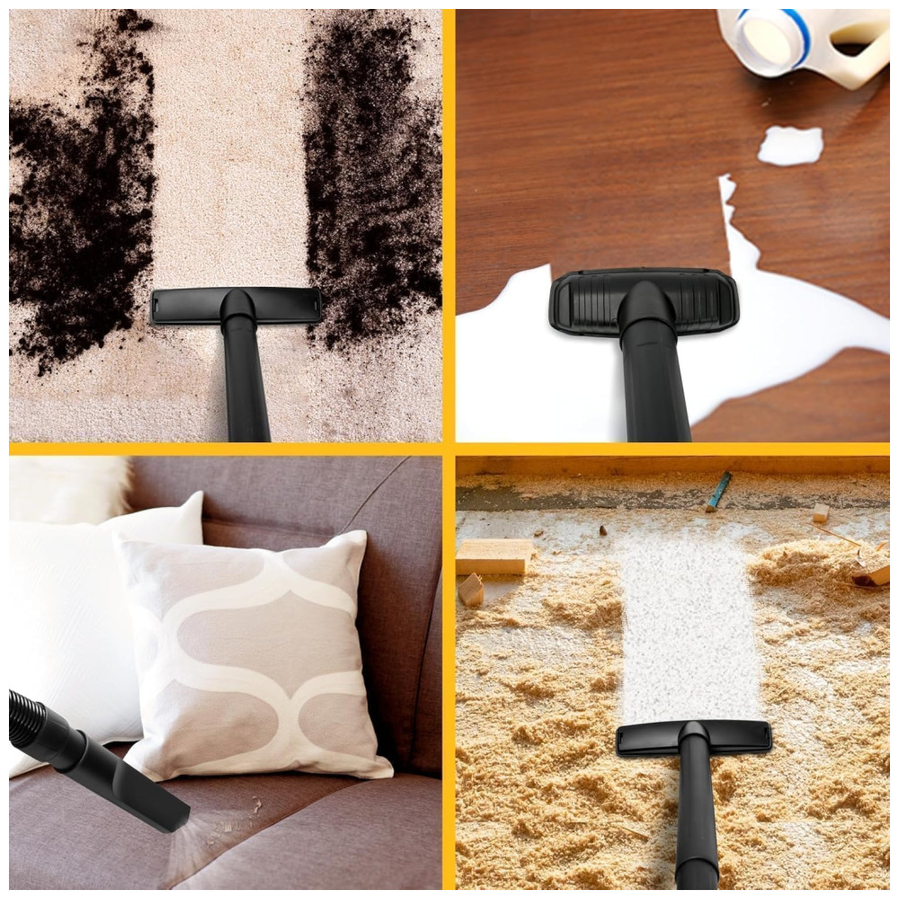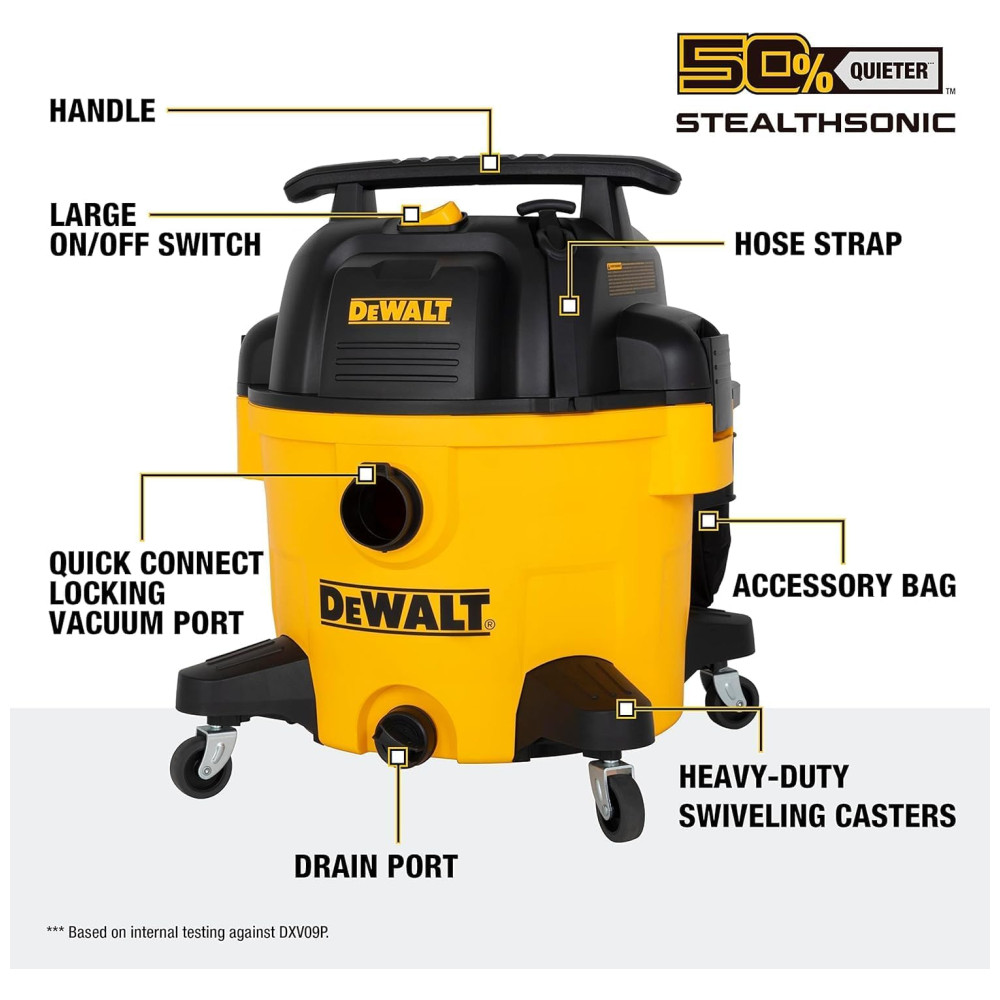 O que você recebe: O DEWALT Wet/Dry Vac inclui: uma mangueira, duas varas de extensão, um bocal de piso, uma escova redonda, uma bolsa de acessórios, um saco de pó descartável, um bocal utilitário, um filtro de cartucho lavável, um bocal para fendas e um manual de instruções.