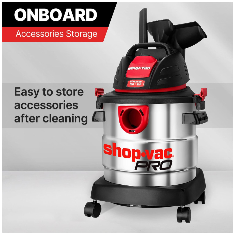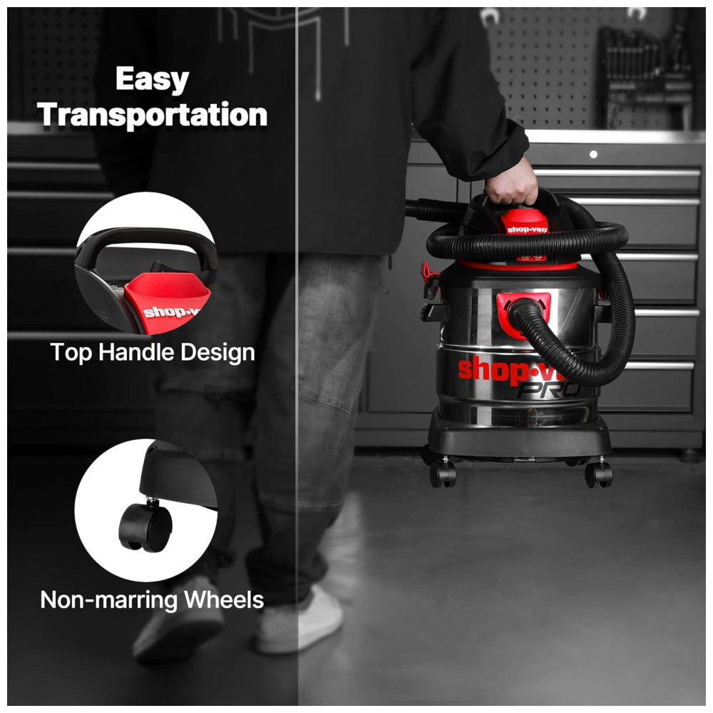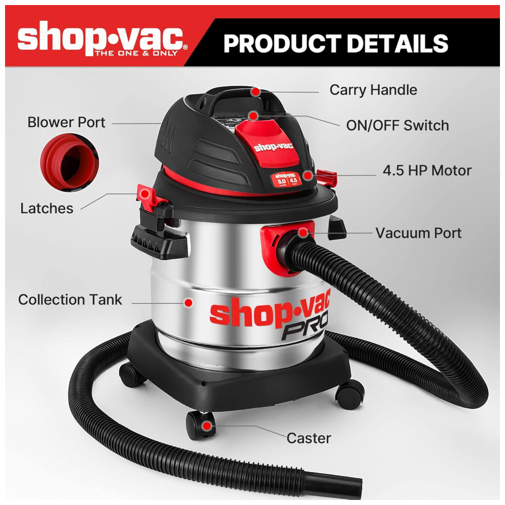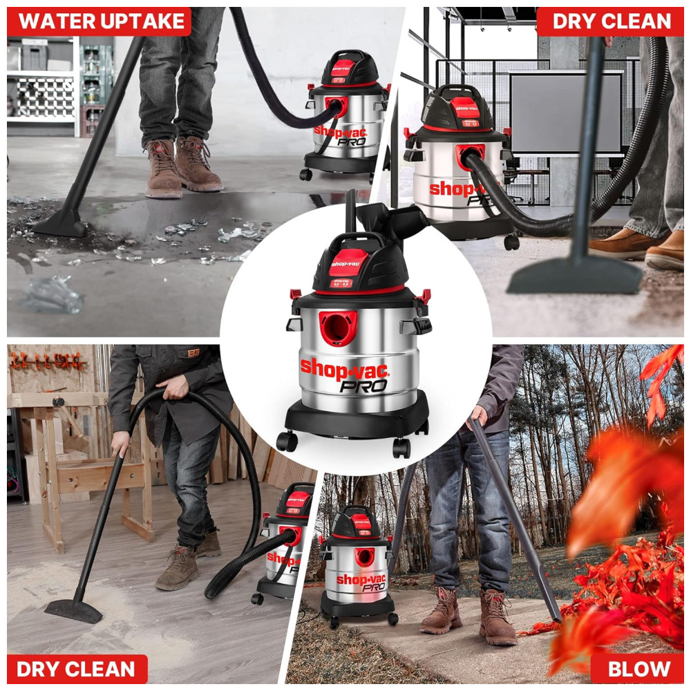 Este aspirador úmido e seco de 18,95 litros com tanque de coleta em aço inoxidável e pico de 4,5CV de potência oferece um desempenho poderoso para facilitar a limpeza em projetos domésticos, na garagem, oficina, veículo e porão. Com uma função 3 em 1, ele possui forte sucção a seco, função de sopro e pode ser facilmente convertido em um soprador de ar potente de 60 cfm para soprar a sujeira de locais de difícil acesso ou aparas de grama de sua calçada. O aspirador também possui sistema de rodízios e alça de transporte superior dobrável para fácil transporte. Além disso, ele tem um grande alcance de limpeza de mais de 3,95 metros com mangueira de diâmetro de 1,82 metros e cabo de alimentação, reduzindo muito o movimento do aspirador e facilitando os trabalhos de limpeza. O tamanho é ideal para praticamente qualquer limpeza doméstica e é ótimo para limpeza de várias superfícies. O produto também inclui acessórios como mangueira 3 varinhas de extensão, 1 bico WetDry de 25 cm, 1 bico Gulper, 1 ferramenta para fendas, 1 escova redonda, 1 filtro de cartucho padrão, 1 saco de filtro descartável e 1 manga de espuma.