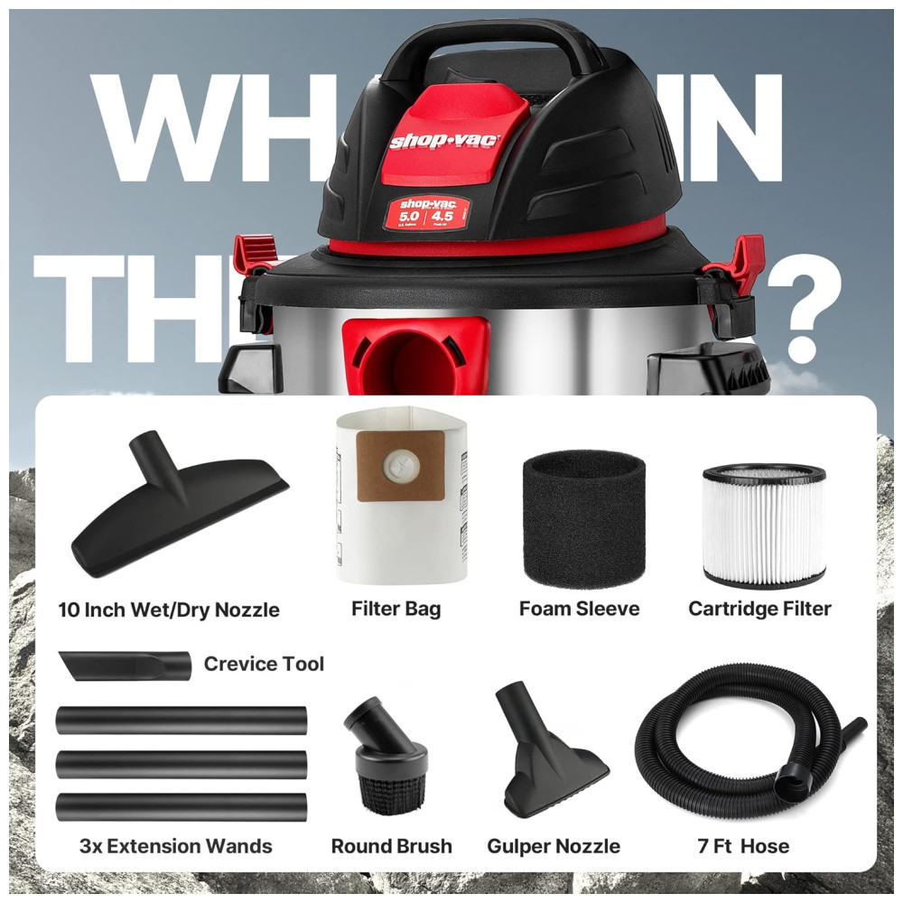 Componentes incluídos Shop Vac, mangueira 7 x 1 1 4, 3 varinhas de extensão, 1 bico úmido e seco de 10 pol., 1 bico Gulper, 1 ferramenta para fendas, 1 escova redonda, 1 filtro de cartucho padrão, 1 saco de filtro descartável e 1 manga de espuma