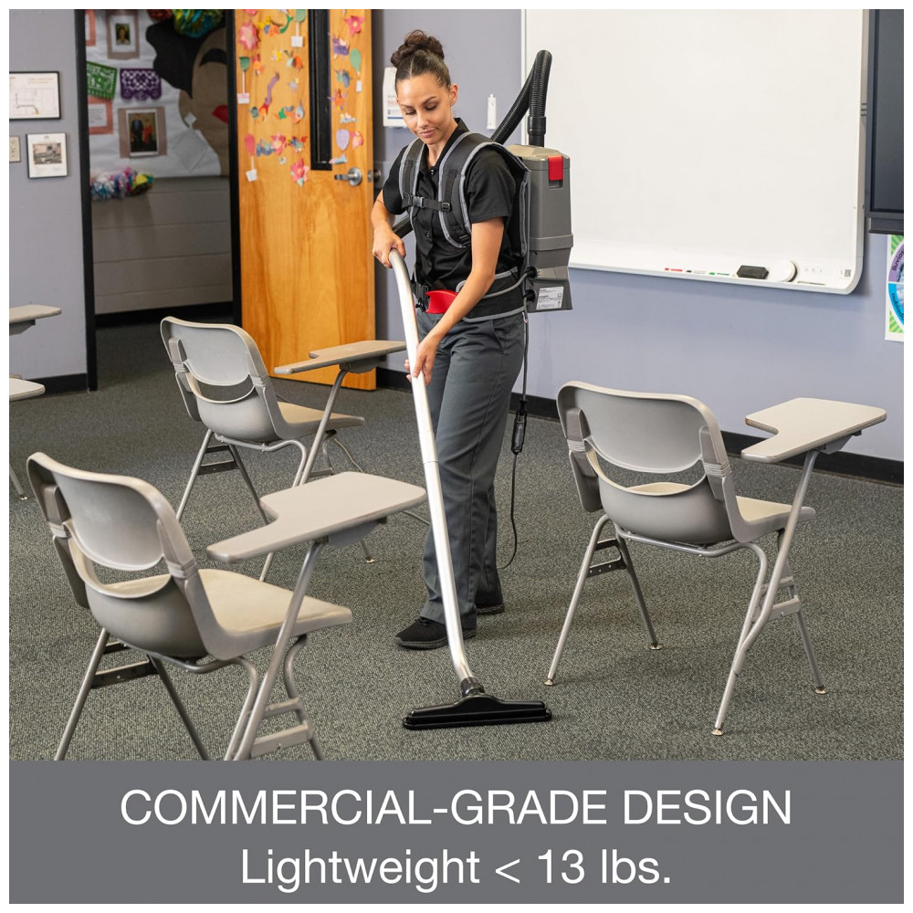 Inclui ferramentas versáteis como haste ajustável, ferramenta de fenda, escova para estofados, escova para poeira, bico para pisos rígidos e bico para carpetes, todas com diâmetro de 38 mm para alcance em áreas elevadas, escadas e superfícies variadas. Estrutura portátil em formato backpack facilita mobilidade em hotéis, escolas e espaços comerciais, com capacidade de 3,8 L no saco descartável para minimizar interrupções.