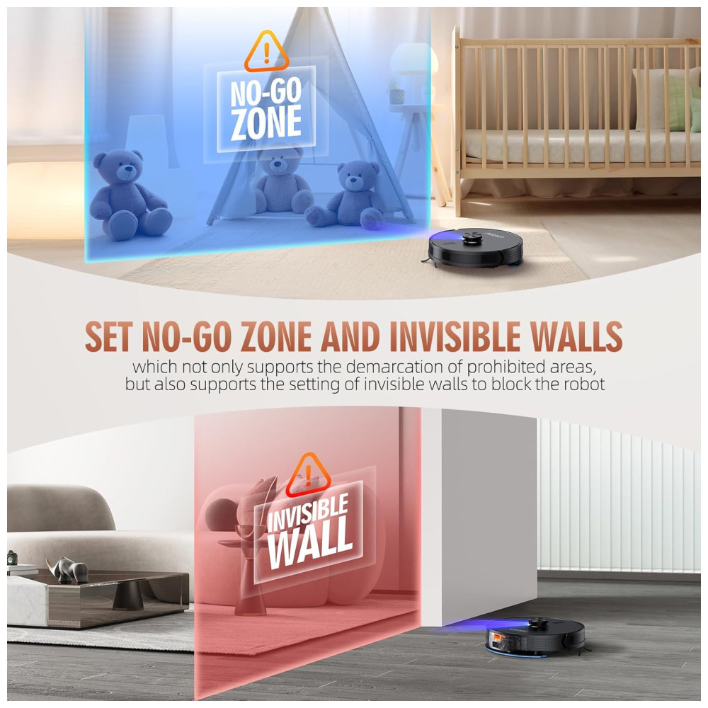 Com uma sucção máxima de 4.500 pa, o aspirador e esfregão robô pode facilmente puxar detritos e pelos de animais de estimação das profundezas do carpete, tornando simples limpar o lixo do dia a dia, como partículas de poeira e cabelos. Personalize seu aspirador robô por meio do aplicativo selecionando modos de limpeza, limpando determinados ambientes, configurando uma parede virtual, colocando uma zona nogo e muito mais.