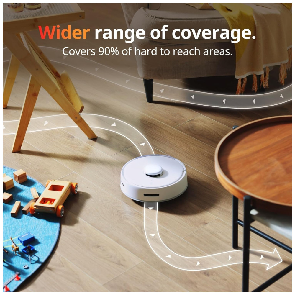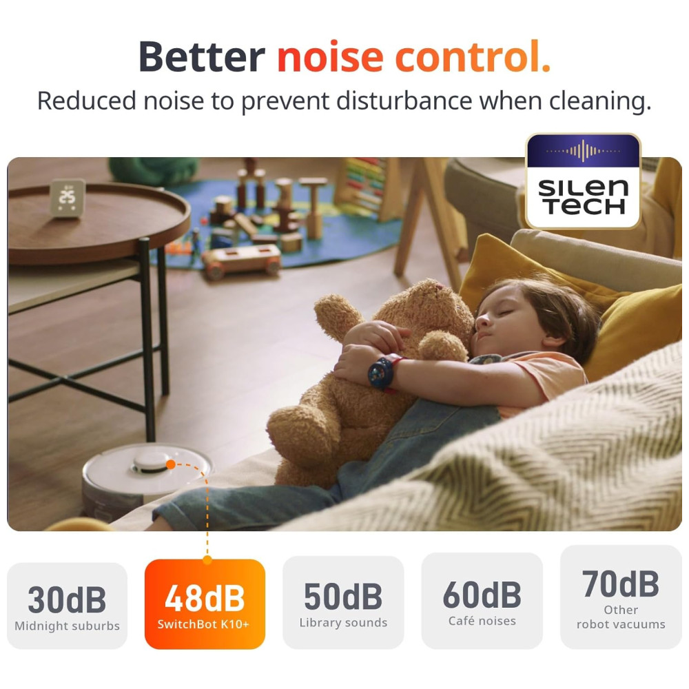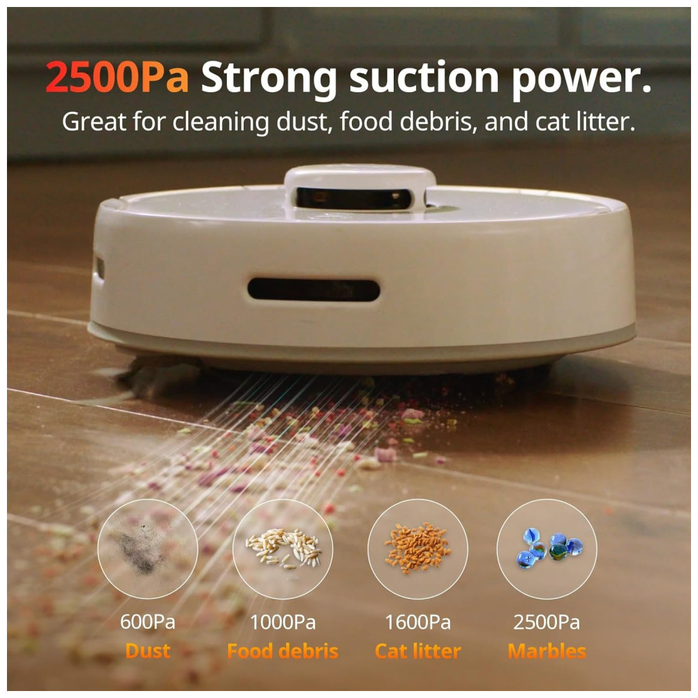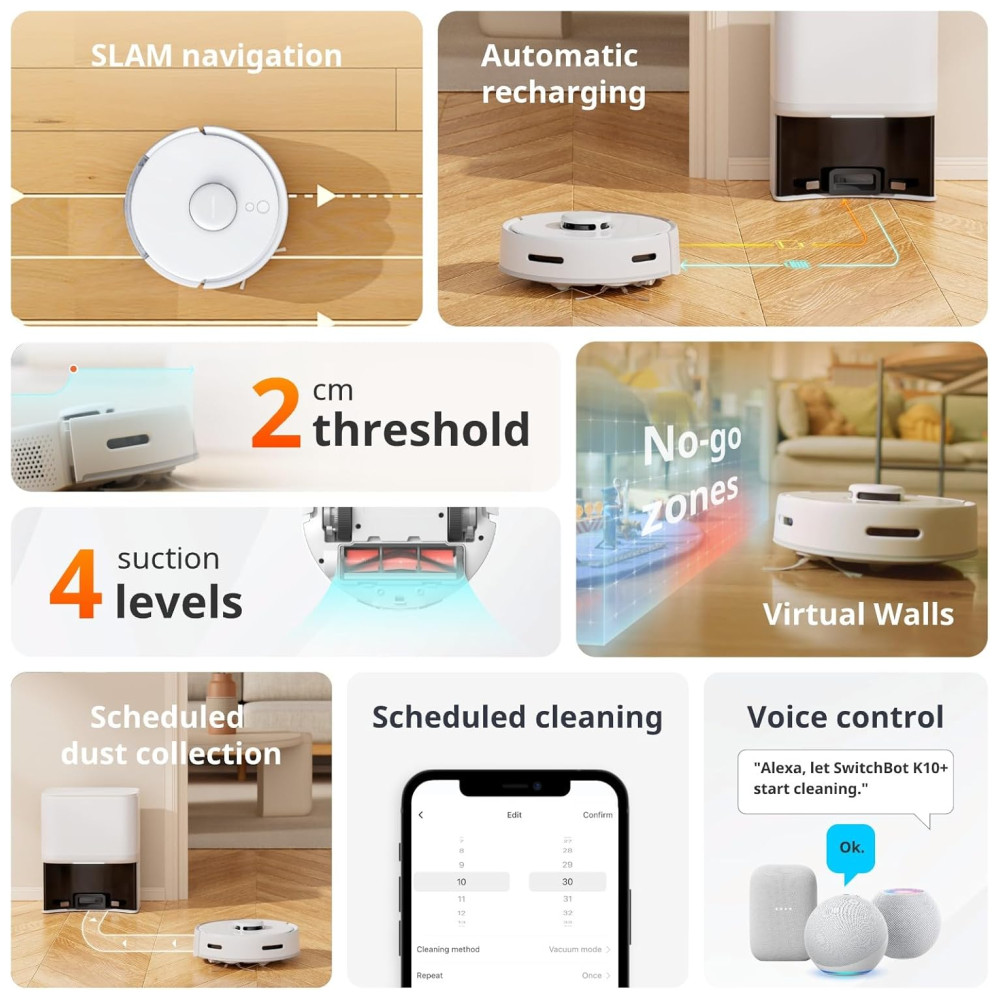 Com um motor personalizado de alto desempenho e design de duto otimizado, o aspirador robô SwitchBot K10 coleta facilmente grandes detritos, como comida de gato e partículas finas a 2500pa. Ele também é inteligente, com uma função de recarga automática para situações de bateria fraca e retoma a limpeza de onde parou após uma carga completa. Você pode personalizar a limpeza através do nosso aplicativo com planos, zonas restritas e usar comandos de voz Alexa, Google Assistant para uma limpeza mais inteligente.