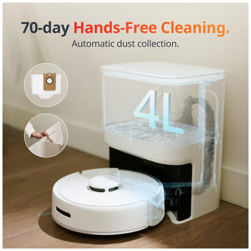 O robô aspirador vem com uma estação base de 4L que retém detritos por até 70 dias. Ele canaliza automaticamente o pó para um saco coletor, tornando a experiência de limpeza mais simples e higiênica, ideal para quem sofre de alergias. Além disso, o K10 emite menos ruído, com apenas 48,0 DB, permitindo uma limpeza silenciosa sem incomodar os vizinhos.