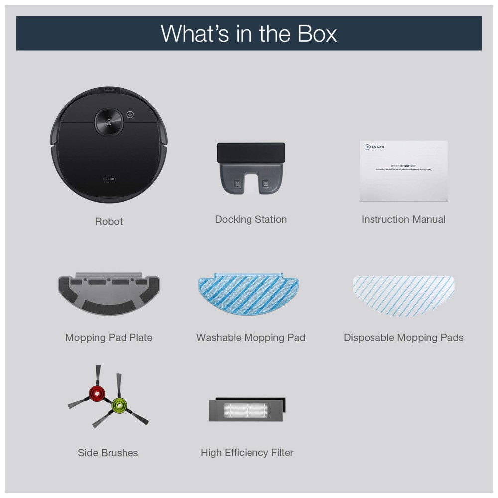 A caixa contém 1 robô DEEBOT N8 Pro, 1 base de carregamento, 1 esfregão lavável, 10 esfregões descartáveis, 2 escovas laterais, 1 filtro de ar altaEfficiency e 1 manual de instruções.