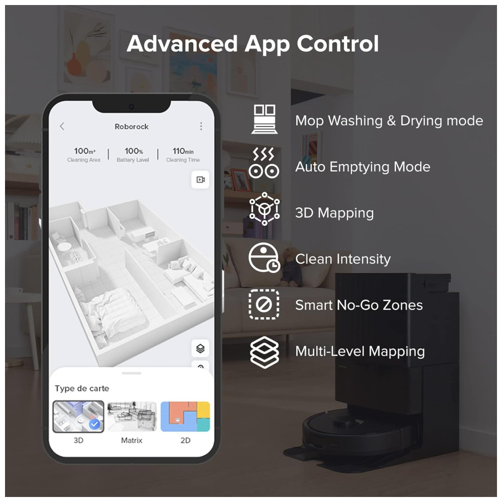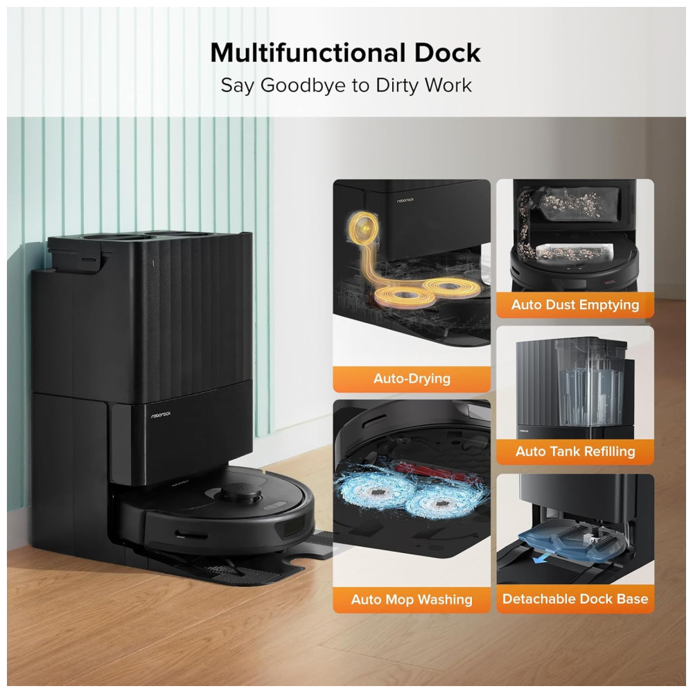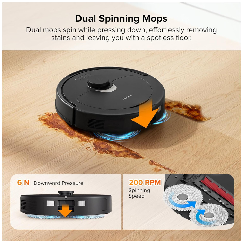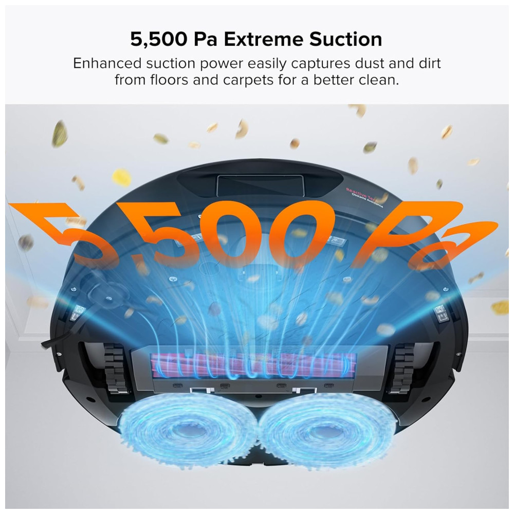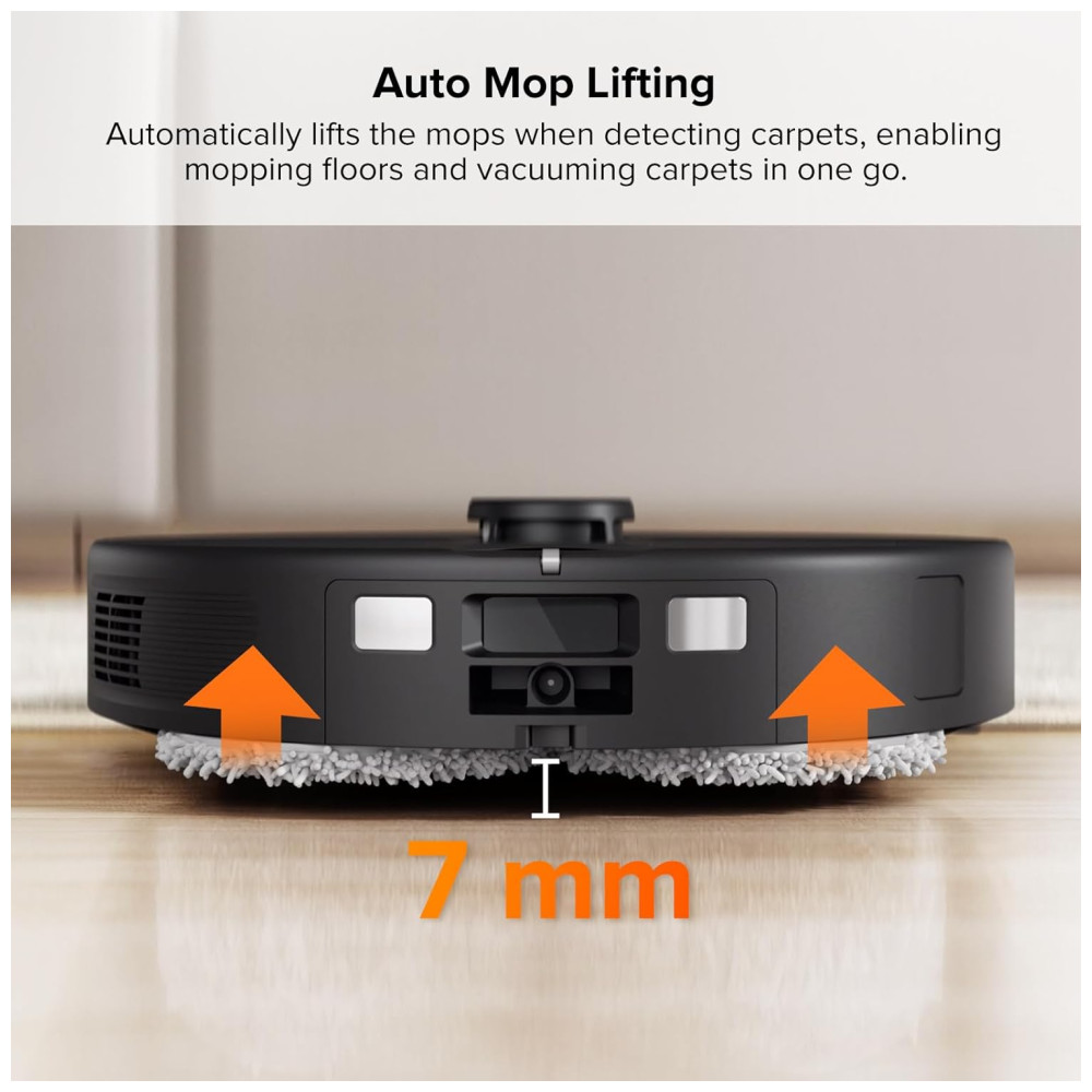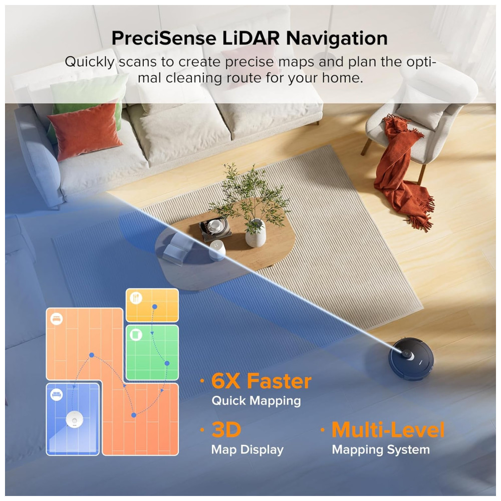 O Auto Mop Lifting de 7 mm permite que você limpe carpetes e pisos com facilidade, enquanto a sucção extrema de 5500Pa ajuda a capturar poeira e sujeira em diferentes tipos de piso. A prevenção de obstáculos com tecnologia reativa detecta e evita obstáculos com precisão total, e a navegação PreciSense LiDAR com tecnologia de mapeamento 3D cria mapas precisos que podem ser visualizados em 3D para uma limpeza precisa e personalizada.