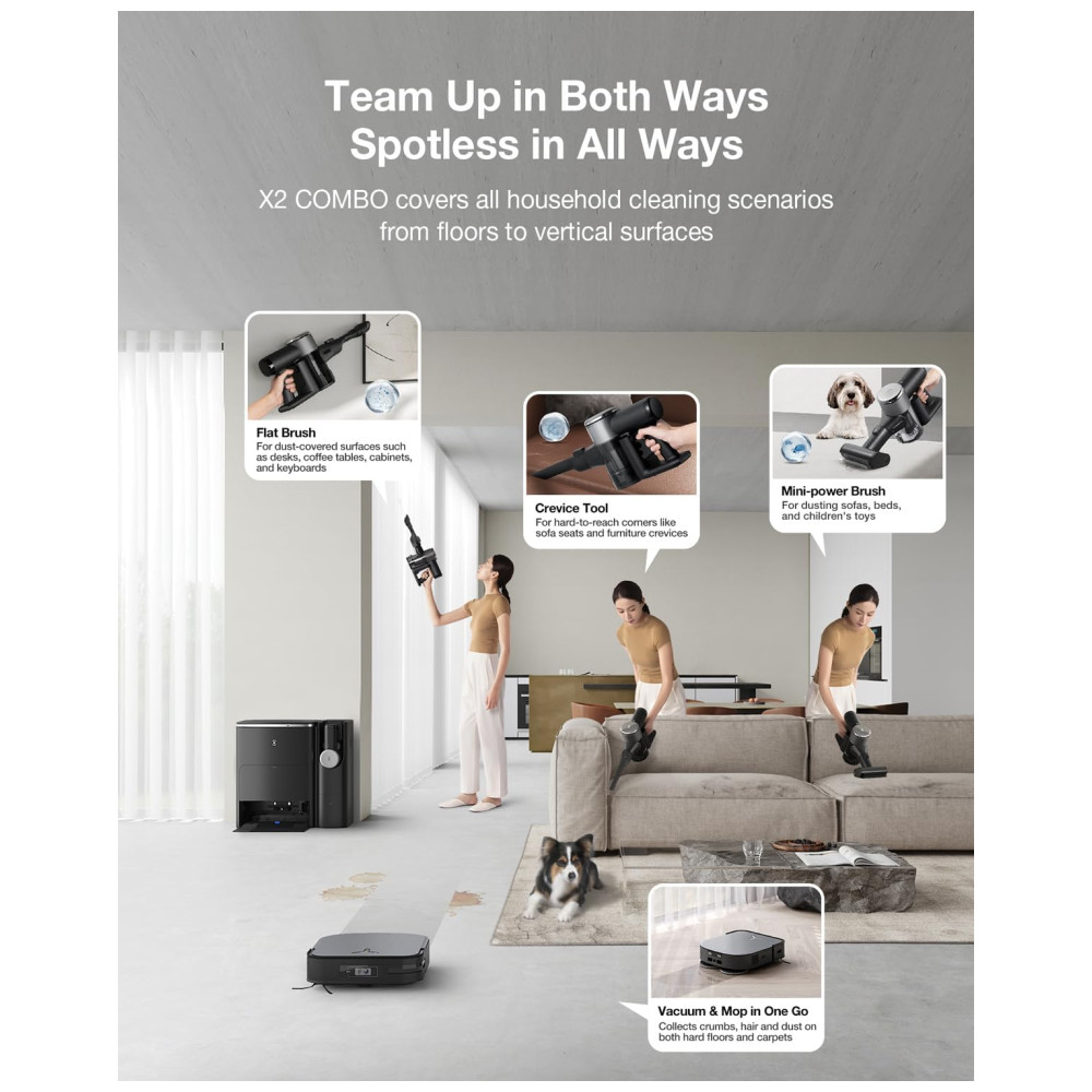 Conheça o X2 Combo, o primeiro robô aspirador portátil do mundo com estação dupla de esvaziamento automático. Com ele, você pode facilmente limpar o chão diariamente enquanto usa o aspirador portátil para outras áreas, tornando a experiência de limpeza muito mais prática e eficiente. O X2 Combo tem um sistema de filtragem de quatro estágios e conjunto Brush Combo, que garante uma limpeza superior em múltiplas superfícies, como sofás e camas.
