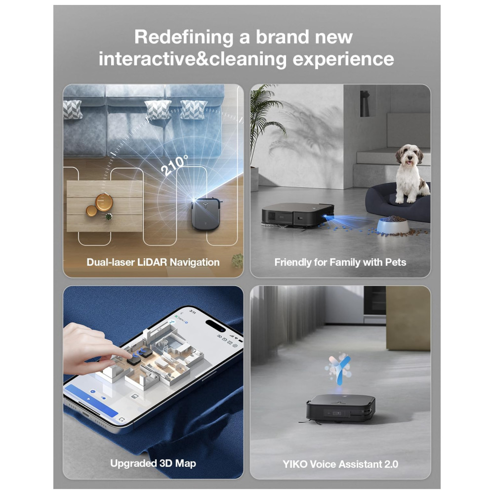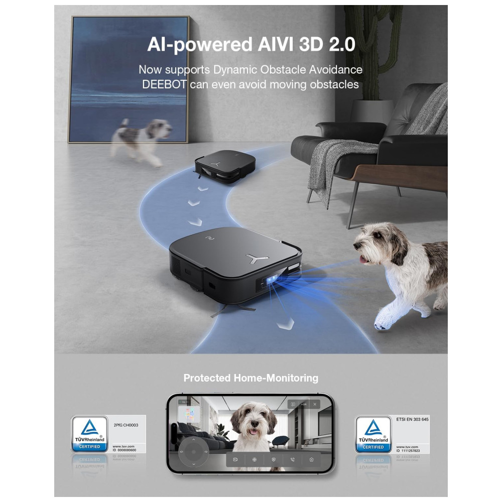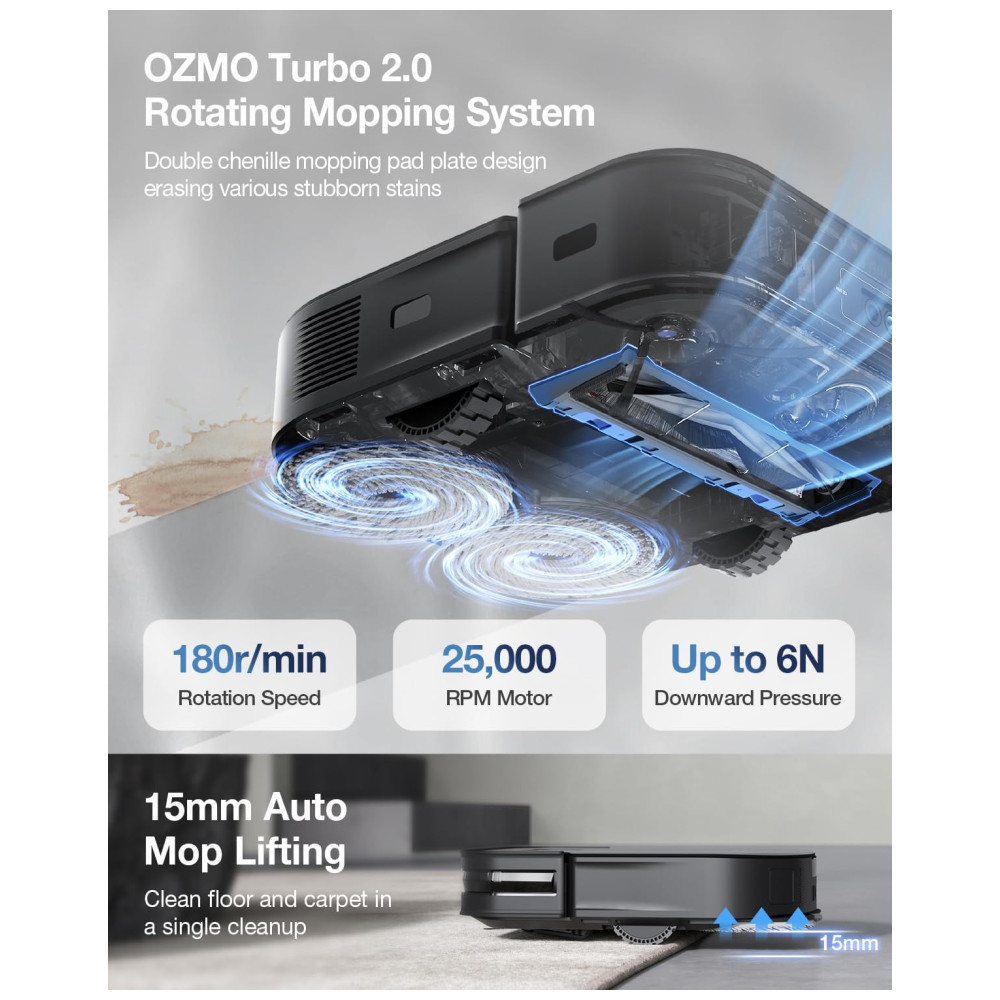 O sistema de evitação de obstáculos controlado por IA AIVI 3D 2.0 garante uma limpeza abrangente em vários ambientes domésticos, navegando sem esforço através de ambientes com muita ou pouca iluminação. O sistema de esfregão rotativo duplo aprimorado OZMO Turbo 2.0 replica os movimentos da mão humana com um motor de alta velocidade de 25.000 RPM, eliminando sem esforço os derrames diários e as sujidades mais difíceis.