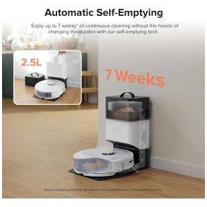 O aspirador robô Q8 Max SelfEmptying oferece conveniência incomparável com o recurso de auto esvaziamento, permitindo até 7 semanas de limpeza contínua sem a necessidade de troca manual da lixeira. Com o aplicativo, é possível personalizar a limpeza de acordo com as necessidades de cada piso e divisão da casa, escolhendo a quantidade de esfregão e fluxo de sucção adequados.