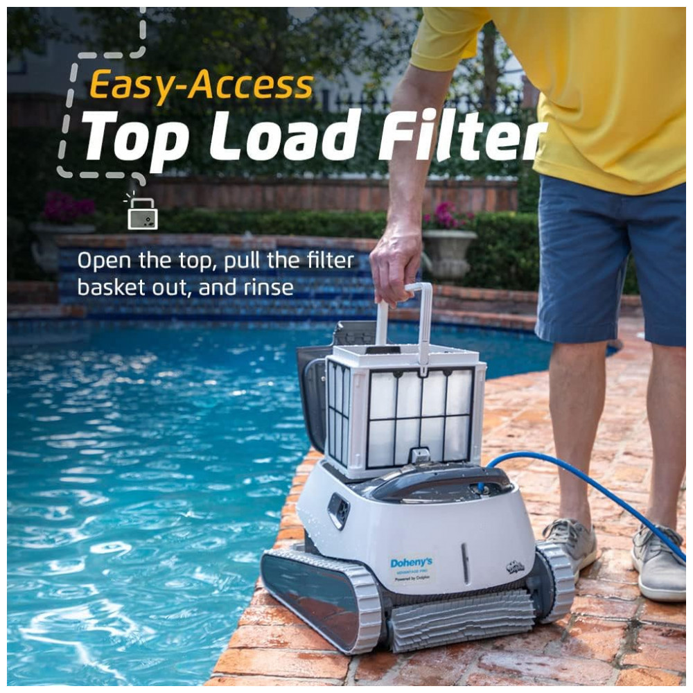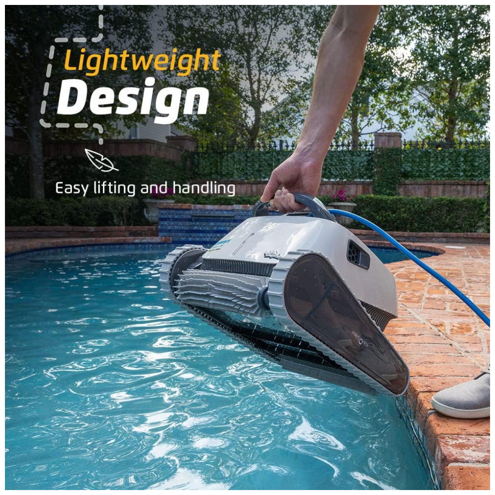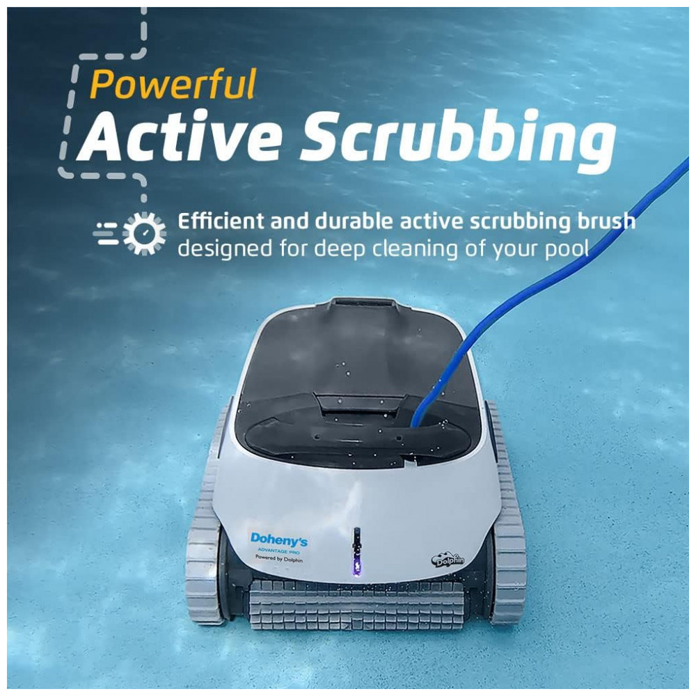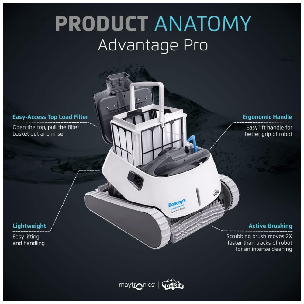 O Dolphin Advantage Pro Wi-Fi é um aspirador robótico para piscinas enterradas com capacidade para piscinas de até 15 metros (50 pés) de comprimento. O equipamento utiliza tecnologia avançada de limpeza com escova ativa que realiza esfregamento eficaz na linha d’água, paredes e piso, garantindo remoção de detritos com mínimo esforço manual. Conta com sistema Wi-Fi para agendamento remoto e controle via aplicativo MyDolphin™, permitindo iniciar, pausar e programar sessões de limpeza a partir de qualquer lugar. Seu filtro de acesso superior facilita a retirada e limpeza de resíduos. O tubo de alimentação elétrico possui 18 metros de cabo com sistema anticompanhamento para evitar emaranhados. O ciclo padrão de limpeza dura aproximadamente 1 hora, ideal para limpezas rápidas e eficientes. O robô pesa cerca de 8,4 kg, e suas dimensões totais são 56,5 x 44,7 x 32,5 cm.