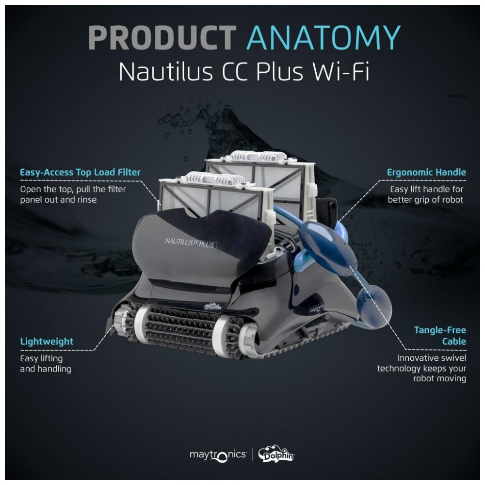 O Dolphin Nautilus CC Plus Wi-Fi é um aspirador robótico para piscinas enterradas com até 15 metros de comprimento, equipado com tecnologia avançada de limpeza inteligente CleverClean™, que garante cobertura eficiente do piso e das paredes. Possui escovas combinadas para remoção ativa de sujeira e filtro de fácil acesso superior para manutenção simples e rápida. O modelo inclui conectividade Wi-Fi, permitindo agendamento e controle remoto por aplicativo MyDolphin™ Plus, que oferece conveniência e monitoramento em tempo real das operações. A alimentação é feita por voltagem 12V AC/DC com cabo de extensão que suporta até 18 metros, e o sistema possui girostabilizador para navegação otimizada e estabilidade na limpeza. O robô é leve para manuseio fácil, com peso aproximado de 9,5 kg e dimensões compactas de 42,0 x 41,5 x 26,5 cm.
