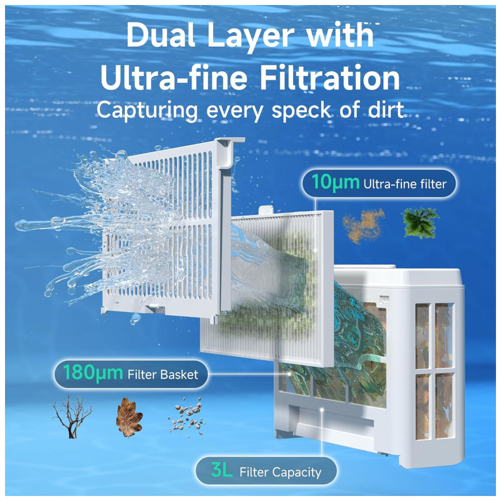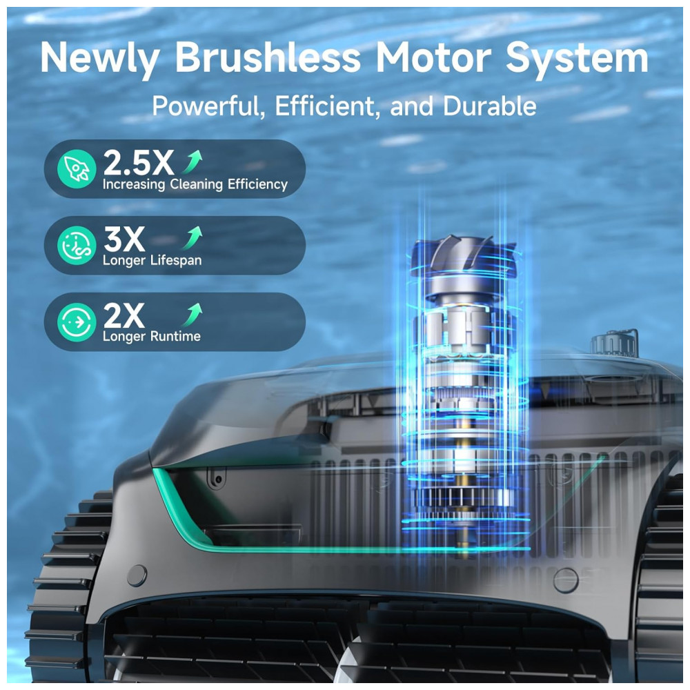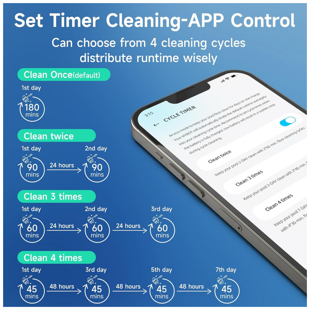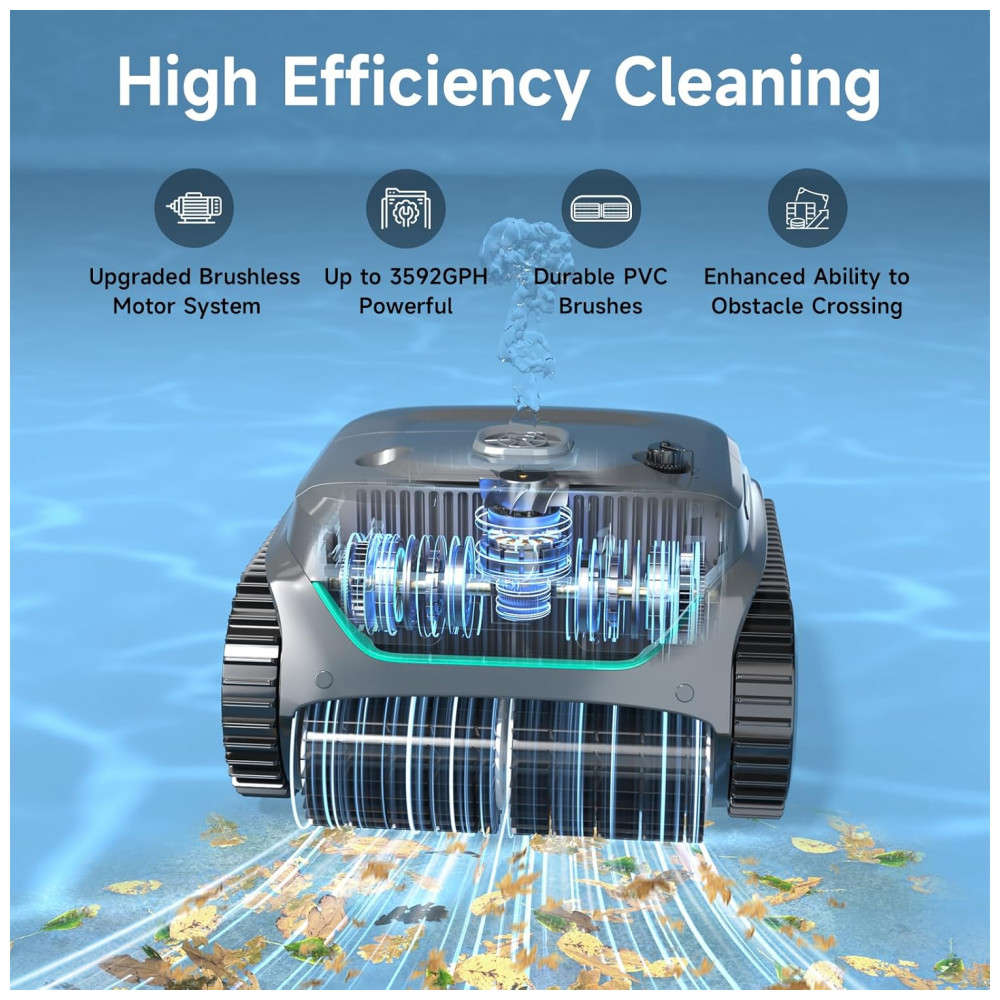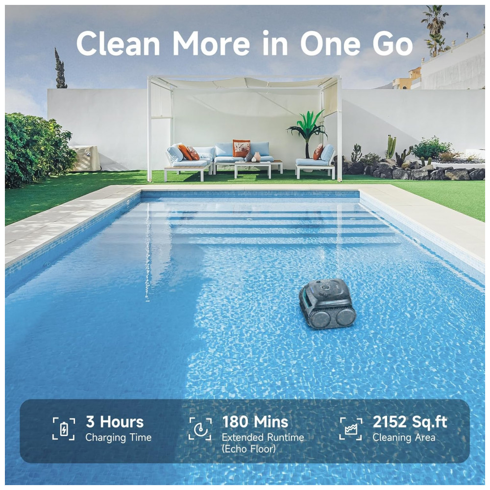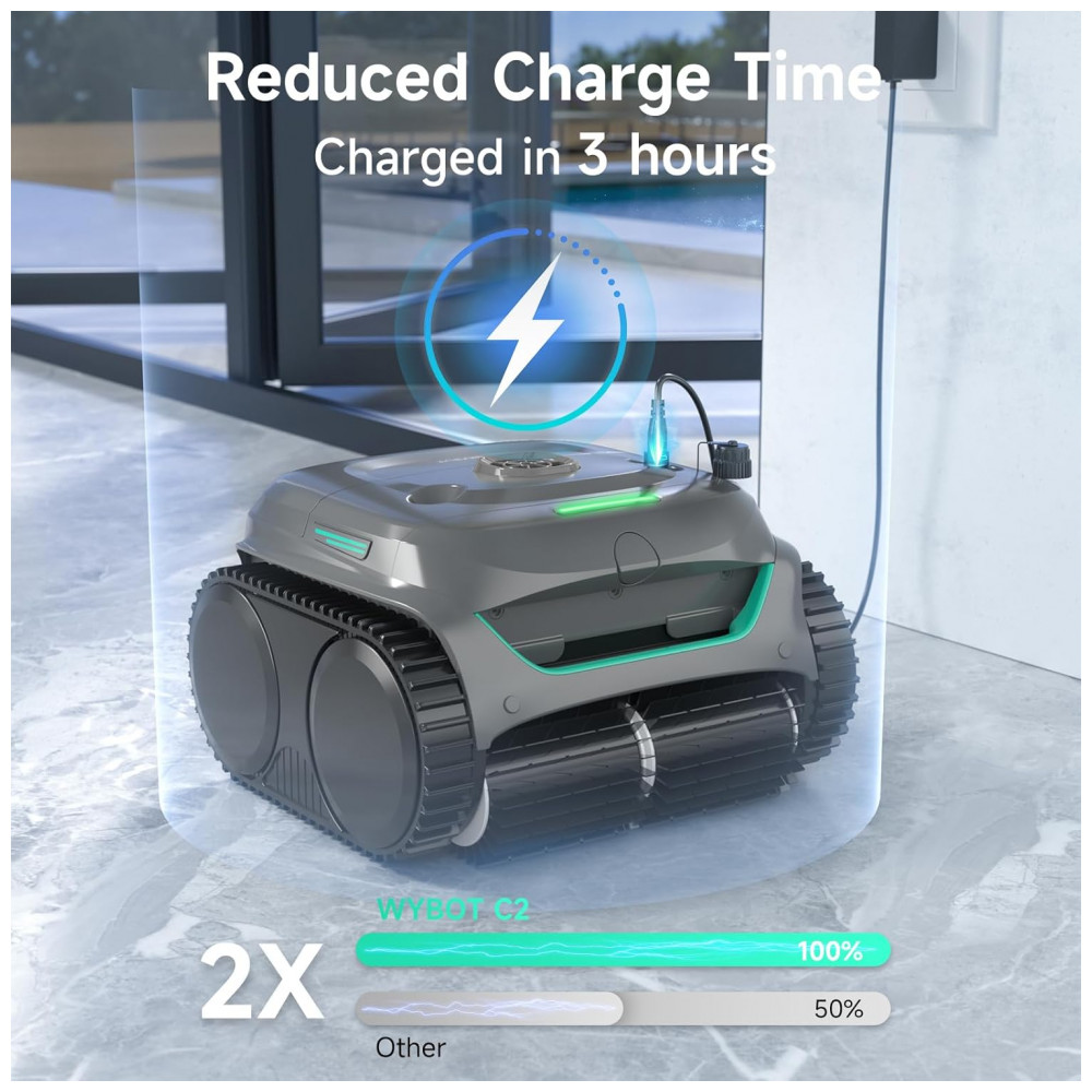 O robô aspirador WYBOT C2 é equipado com três motores brushless que proporcionam sucção potente de até 3.593 GPH, ideal para limpeza completa de piscinas enterradas e elevadas de até 200 m². O sistema de filtração dupla combina um filtro principal de 180 micra para partículas maiores e um filtro ultrafino de 10 micra, garantindo retenção eficiente de detritos, poeira fina e areia. Possui bateria recarregável com autonomia de até 180 minutos no modo econômico, com tempo de recarga aproximado de 3 horas. Seu design sem fio elimina emaranhados e facilita o uso. O robô possui seis caminhos e sete modos de limpeza, controlados via aplicativo dedicado para personalização, agendamento de limpezas e atualizações OTA. Sensores de alta precisão permitem navegação inteligente para cobertura otimizada das superfícies de piso, paredes, escadas e linha d’água. Conta ainda com sistema de estacionamento automático para fácil recuperação após o uso. Estrutura construída em plástico resistente, com dimensões de 43 x 40,6 x 28 cm e peso de 1,8 kg.