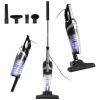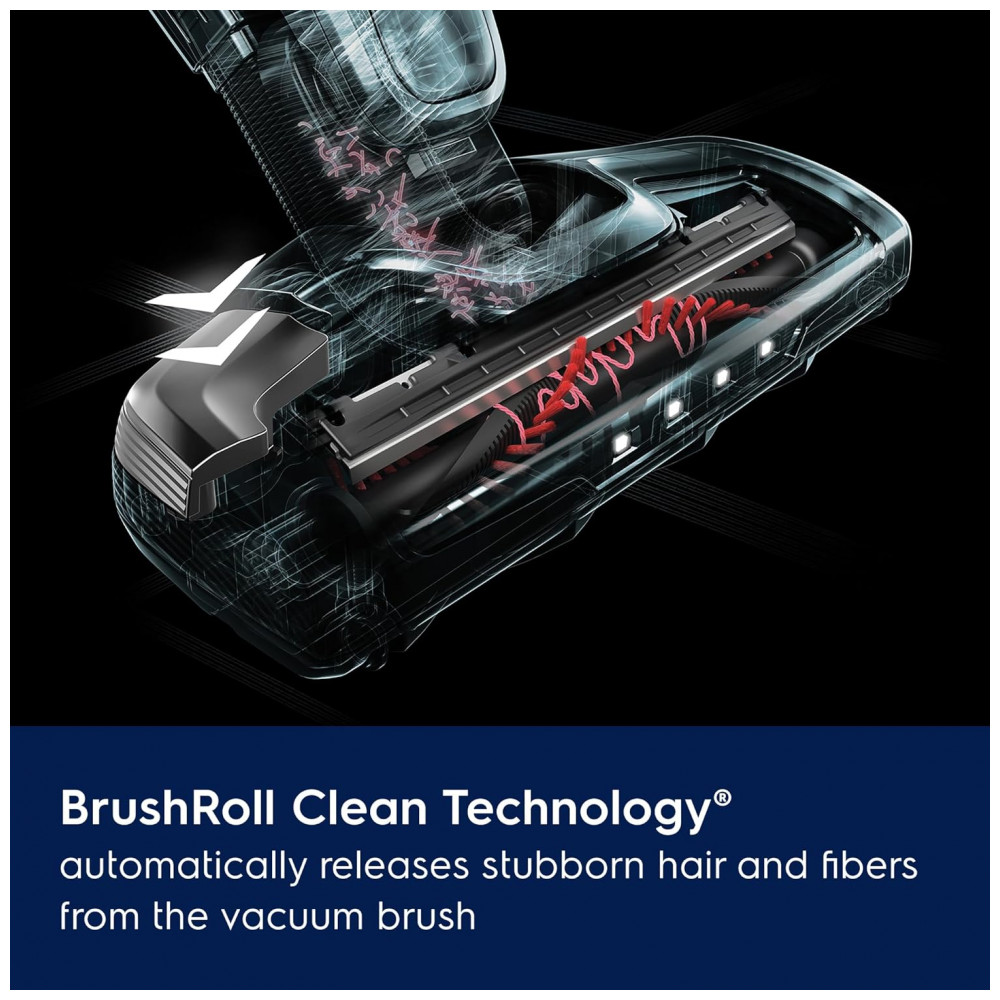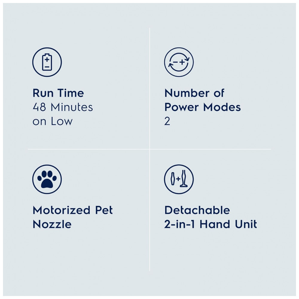 Inclui acessórios como bico pet motorizado, ferramenta de fenda longa, ferramenta 2-em-1 com escova para poeira e escova delicada para superfícies sensíveis, além de suporte de carregamento com recarga em 4,5 horas. Controle por botão de pressão facilita operação em escadas, interiores de carro e cantos de difícil acesso.