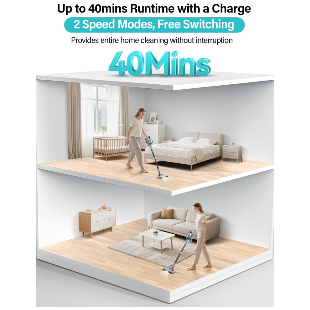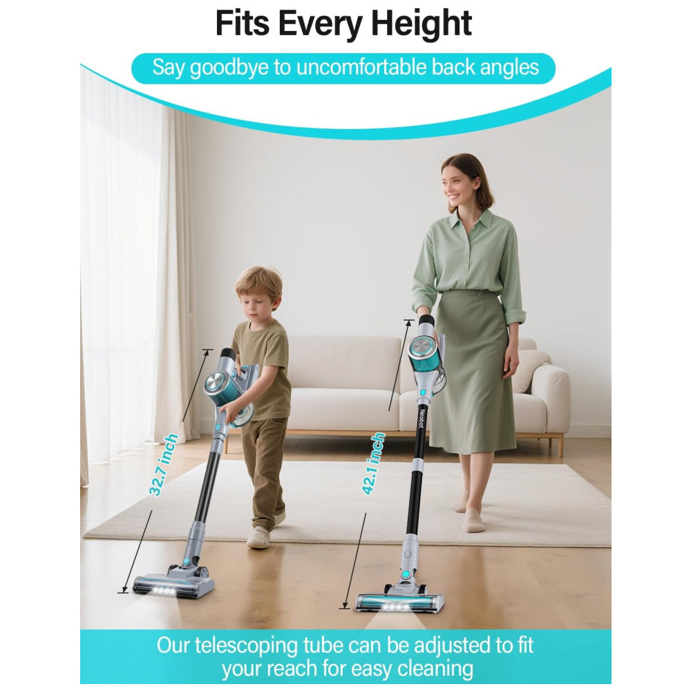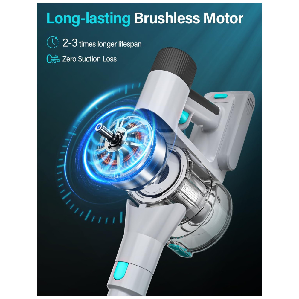 Característica Especial: Motor sem escovas atualizado (vida útil 2-3x maior) / Função de sifão única (evita que a sujeira caia) / Ultraleve (apenas 5 lbs) / 2 modos de sucção ajustáveis / Escova de piso rotativa anti-emaranhado / Filtro lavável de múltiplas camadas HEPA / Suporte de parede recarregável /