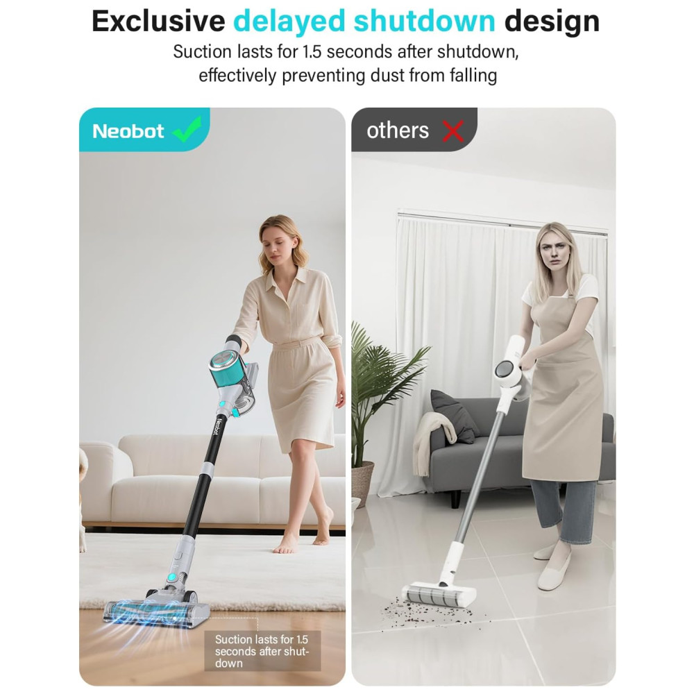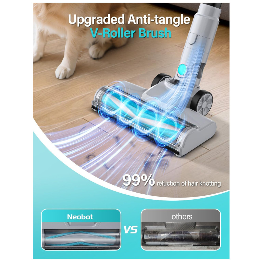 O Aspirador de Pó sem Fio Neobot é equipado com uma bateria removível de grande capacidade e 2 modos de sucção ajustáveis, proporcionando até 40 minutos de autonomia. Com menos de 5 lbs, é fácil de manobrar e perfeito para todas as idades. Seu design plano de 180º permite limpar facilmente embaixo de móveis baixos, e suas 4 luzes LED ajudam a identificar poeira em locais escuros. Possui uma função única de sifão que evita que a sujeira caia após desligado. Seu motor sem escovas dura 23 vezes mais que os motores tradicionais, mantendo a potência de sucção constante ao longo do tempo. A escova de piso rotativa anti-emaranhado é ideal para pelos de animais, garantindo eficiência na limpeza de cantos e embaixo de móveis. Com um sistema de filtração eficiente que retém até 99% da poeira fina e pólen, evitando que circulem no ar, é perfeito para lares com crianças e animais de estimação. Leve, moderno e fácil de usar, o aspirador Neobot é a escolha ideal para famílias, profissionais ocupados e idosos. Não importa se está limpando pisos de madeira, escadas ou cantos apertados, este aspirador torna suas tarefas domésticas muito mais fáceis.