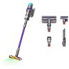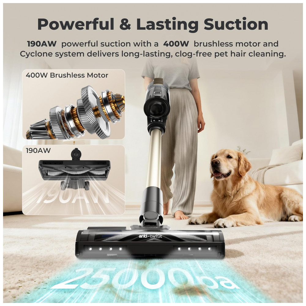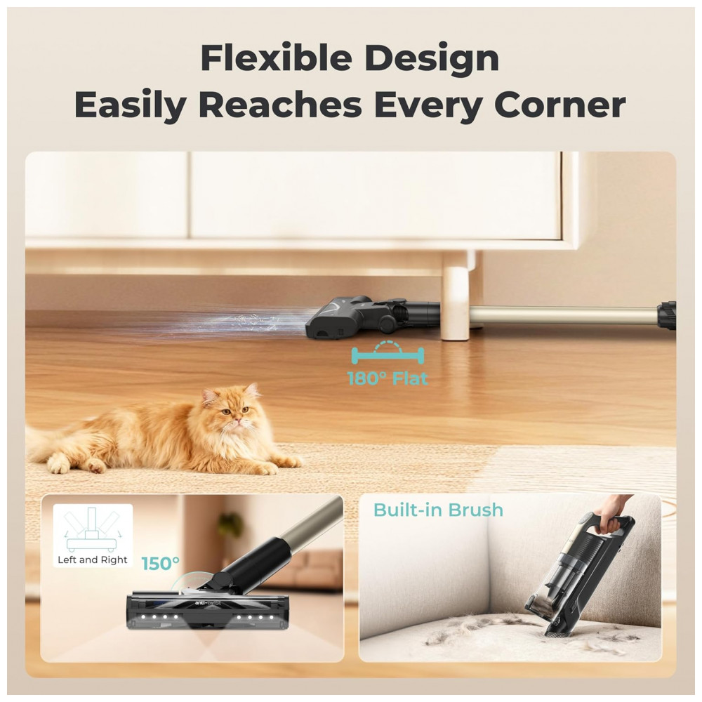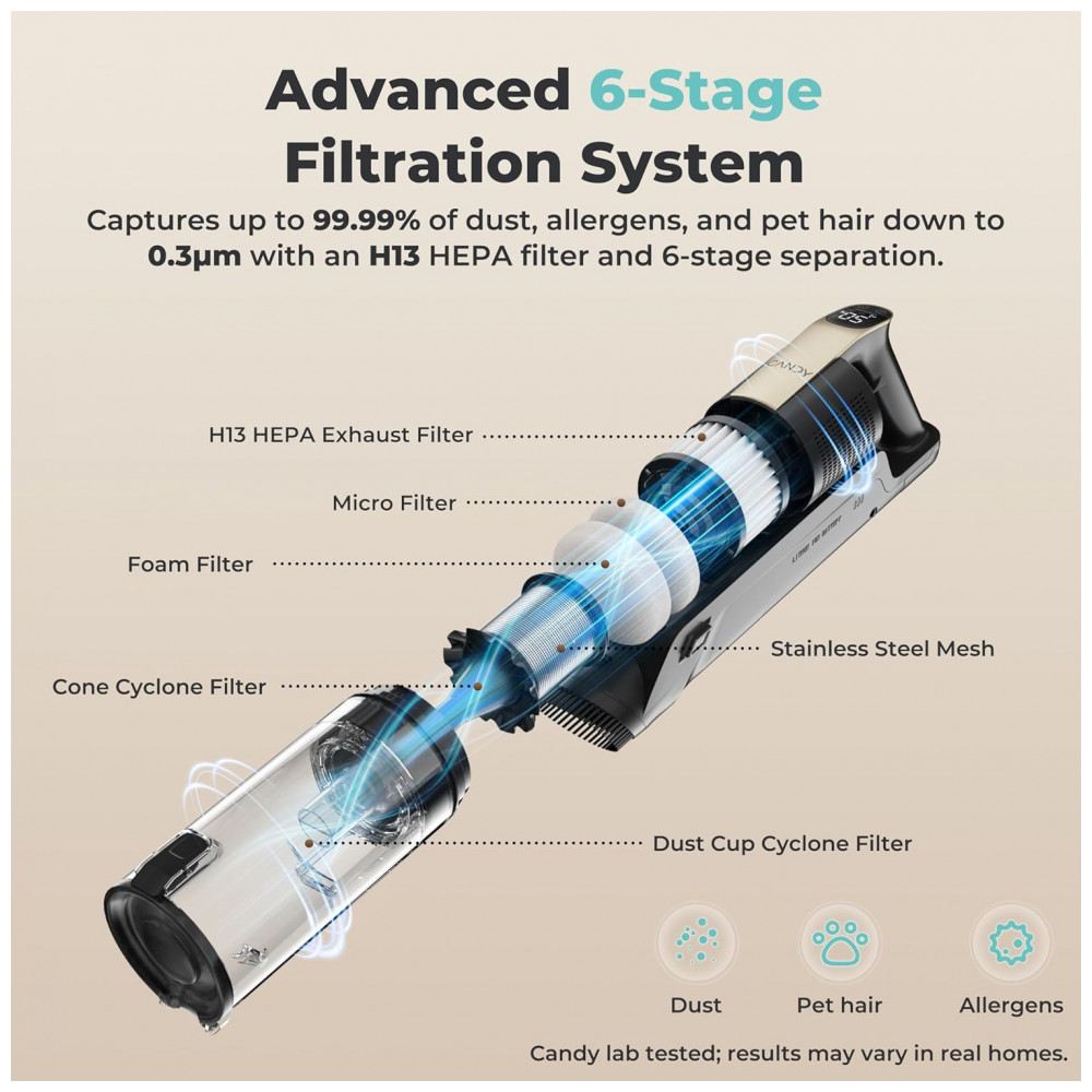 Escova V com rolos de diferentes durezas e lâminas removedoras previne emaranhados, com inclinação plana de 180° para acesso sob móveis. Filtragem HEPA de 6 estágios captura 99,97% de partículas de 0,3 mícron, com componentes removíveis (escova, filtros, copo) para manutenção simples. Estrutura 2-em-1 converte para handheld com 4 rodas para manobras suaves e suporte de carregamento.