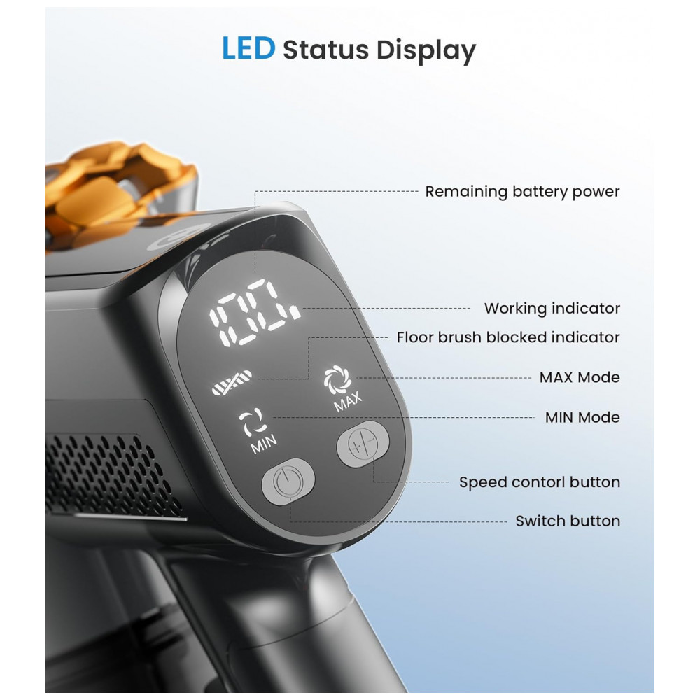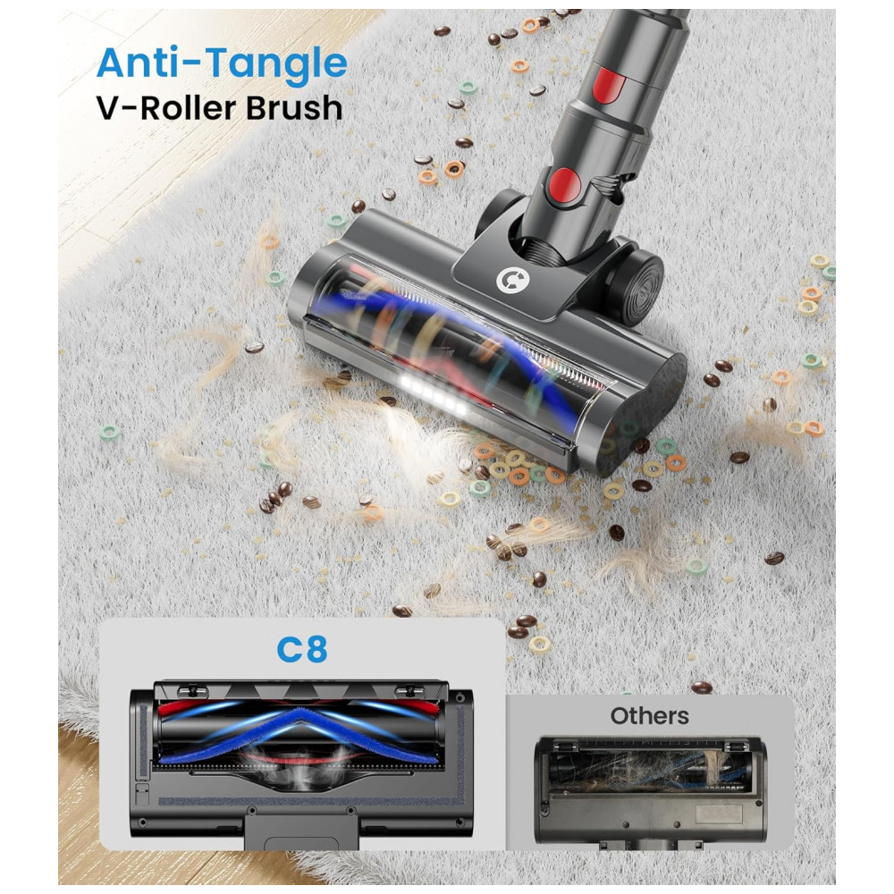 O aspirador CHEBIO C8-US-NEW utiliza motor de 500 W gerando 45 kPa de sucção em dois modos: Eco (até 60 minutos) para pisos rígidos e Máx (20-25 minutos) para carpetes e pelos resistentes. A escova em V anti-emaranhado separa fios com 5 LEDs de alta luminosidade e rotação omnidirecional de 180°, acessando sob móveis e obstáculos. Display LED HD mostra bateria em tempo real (precisão de 1%), modo ativo e status da escova.