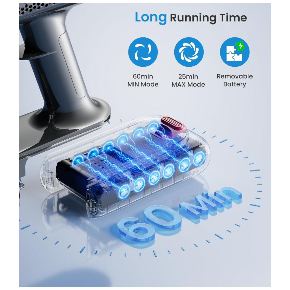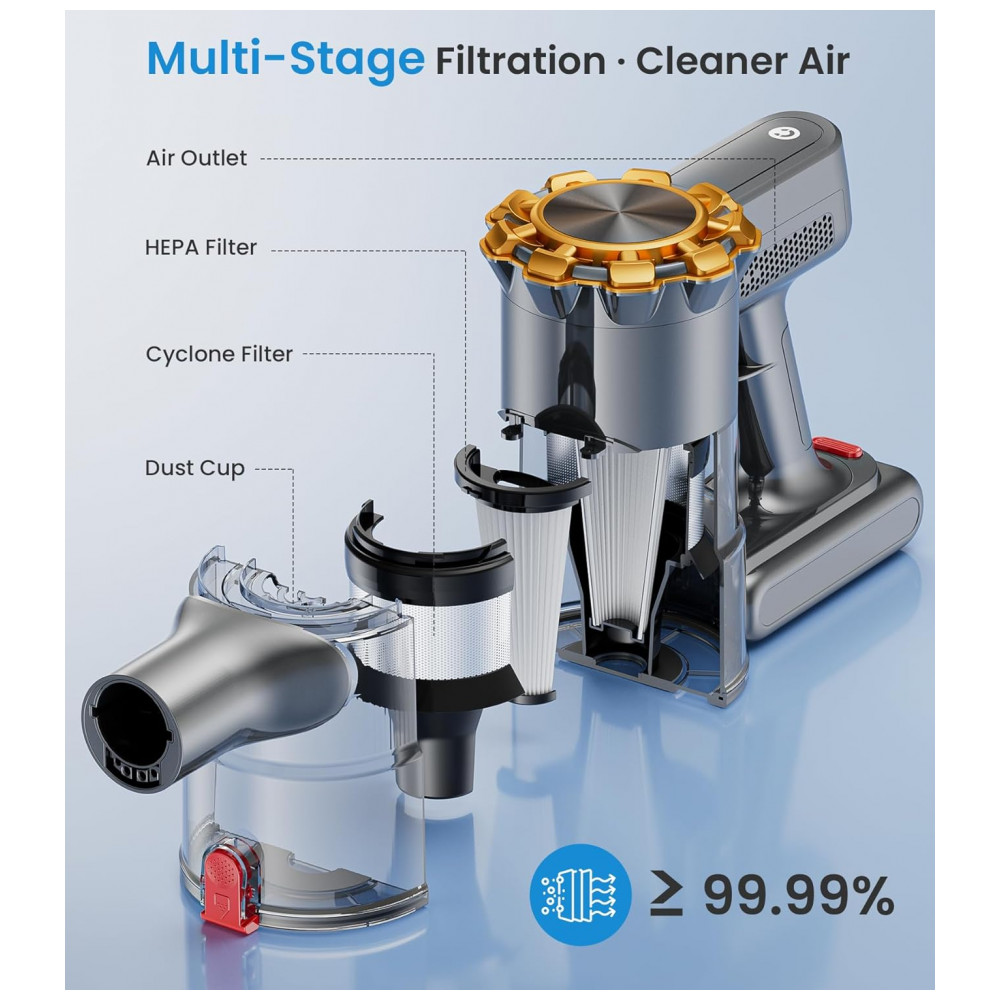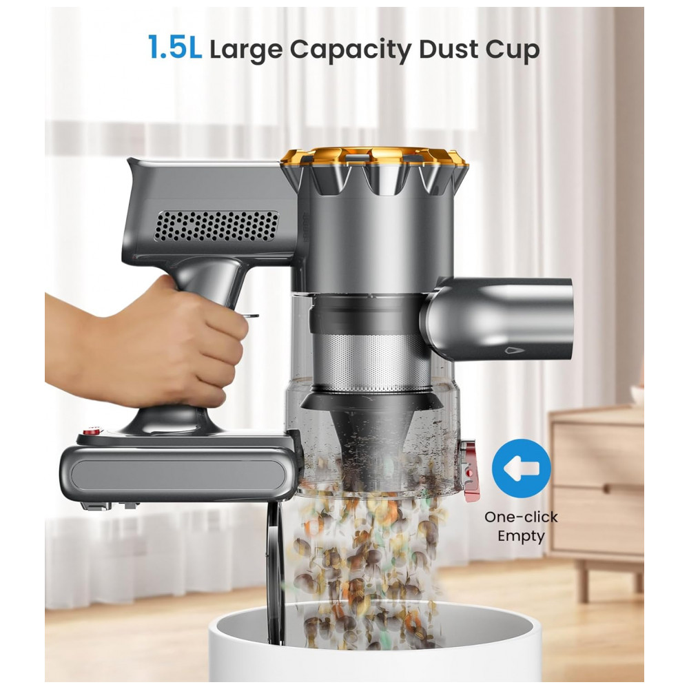 Sistema ciclônico com filtro HEPA de alta densidade captura 99,99% de partículas, integrado a copo de 1,5 L com liberação por um toque. Bateria removível de lítio recarrega em 4 horas, com suporte de parede para carregamento e armazenamento. Estrutura 8 em 1 converte para portátil com tubo telescópico ajustável e acessórios como escova 2-em-1 e removedor de pelos.