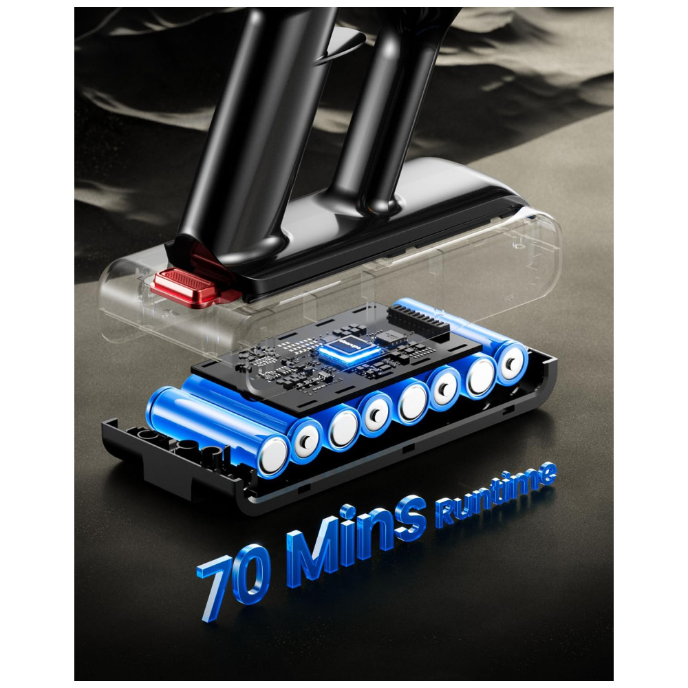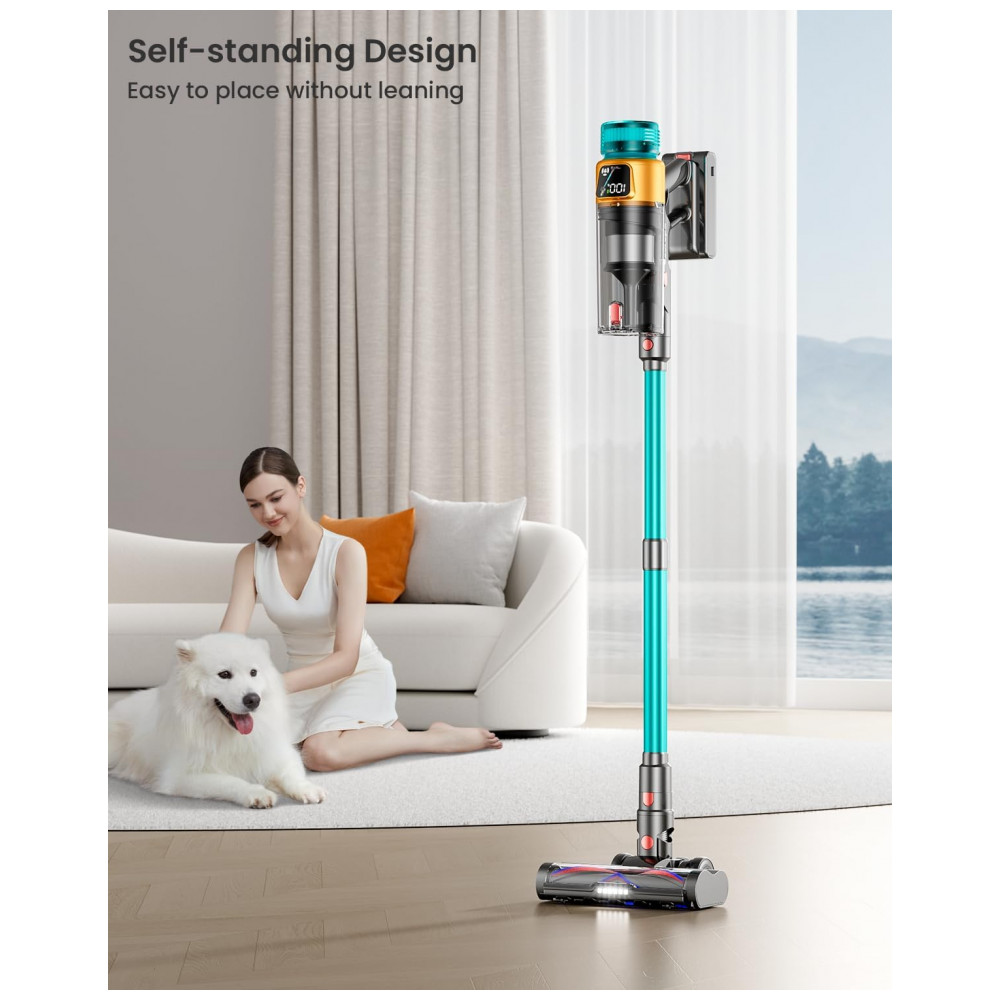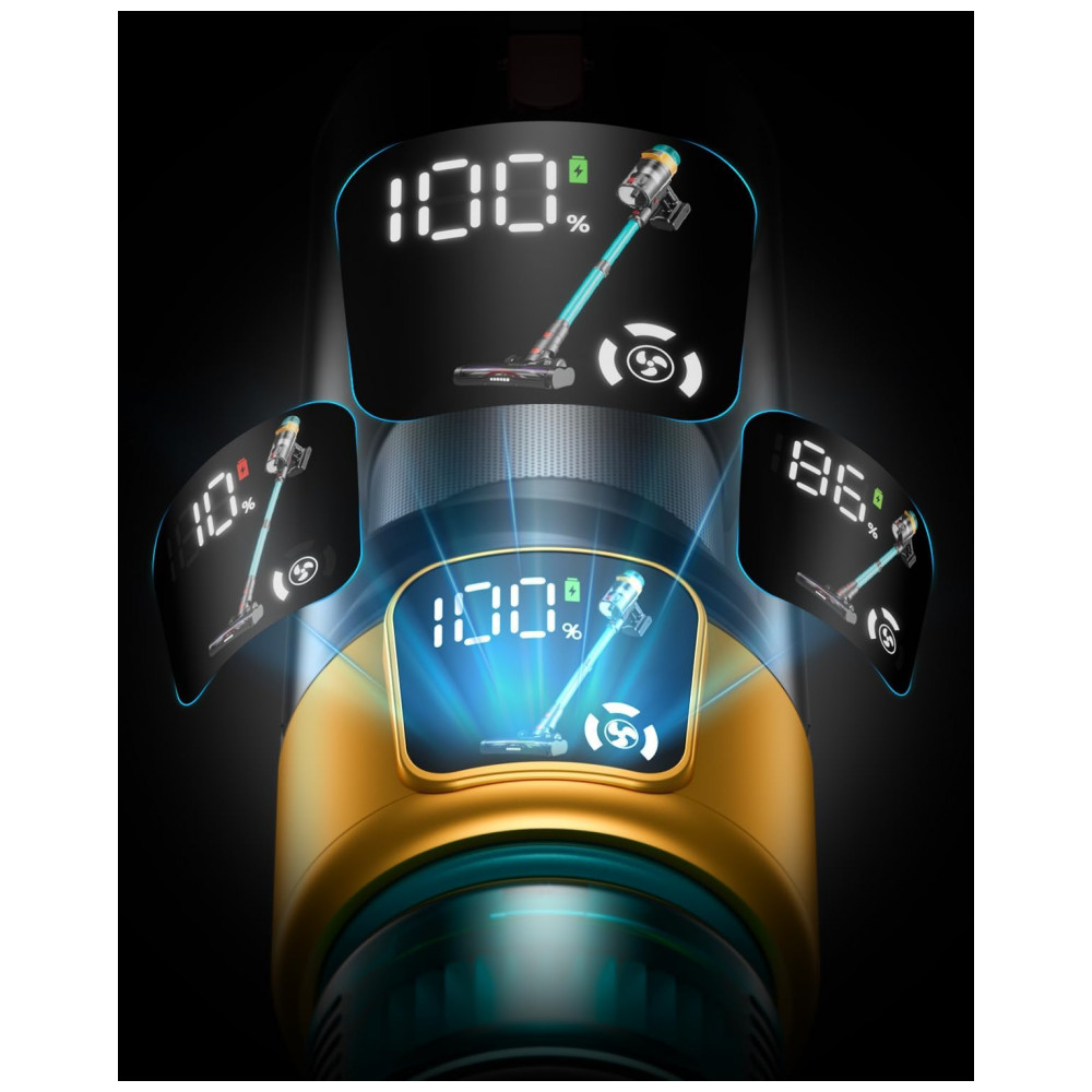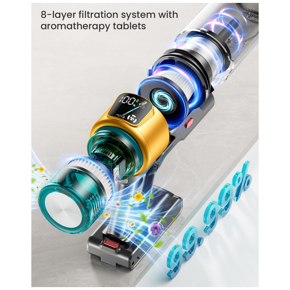 A Máquina de Aspirar Sem Fio dsorupa V10 Ultra utiliza motor brushless de 600 W com sucção de 50 kPa para limpeza eficiente em pisos duros, carpetes e pelos de animais. Equipada com sistema de filtração em 8 etapas incluindo HEPA, captura partículas de até 0,1 mícron com eficiência de 99,99%, combinada com tecnologia ciclone para separação de poeira. Oferece autonomia de até 70 minutos em 2 níveis de potência, display LED para monitoramento e modo ultra-silencioso de 64 dB.