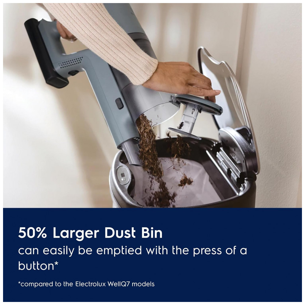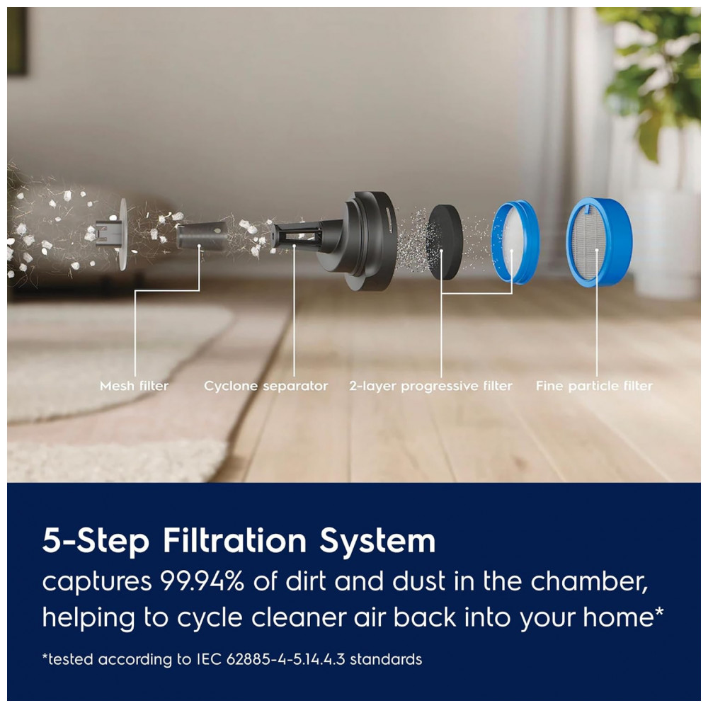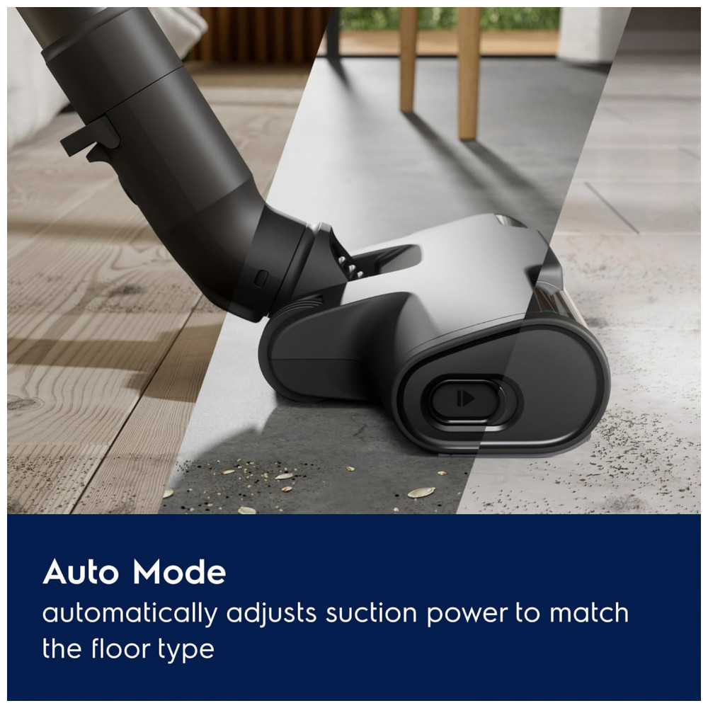 O aspirador sem fio Electrolux Ultimate600 utiliza bico PowerPro Bristle com luzes LED para captura de poeira em pisos rígidos, integrado a sistema de filtração em 5 etapas que retém partículas no compartimento interno. Design leve em formato stick com unidade manual destacável e copo de pó de 0,5 L esvaziável por botão, suporta 3 modos de potência incluindo Auto que ajusta sucção automaticamente conforme tipo de piso para otimização em múltiplas superfícies. Bateria de íons de lítio proporciona até 50 minutos de autonomia em modo mínimo, com recarga em 4,5 horas via dock dedicado e display LED inteligente para monitoramento de bateria e manutenção.