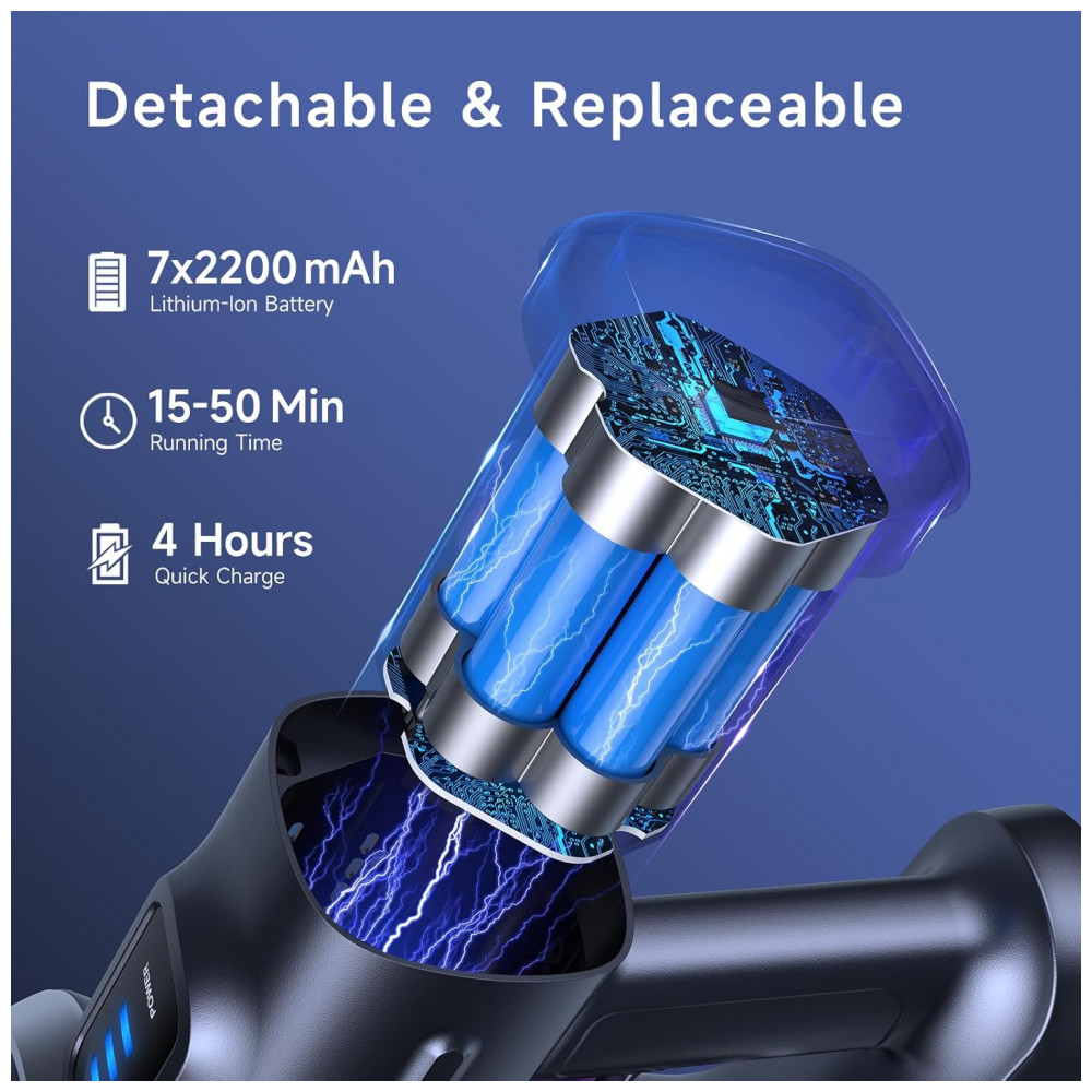 Bateria removível de 7 células 2200 mAh suporta até 50 minutos em modo mínimo, 30 minutos em médio e 15 minutos em máximo, com carregamento direto no aparelho ou separado em 4-5 horas. Configuração 6-em-1 converte para handheld com tubo telescópico, escova para poeira, bico de fenda longo e suporte de acessórios, operando silenciosamente a 69 dB para uso prolongado em ambientes internos.