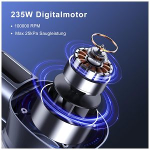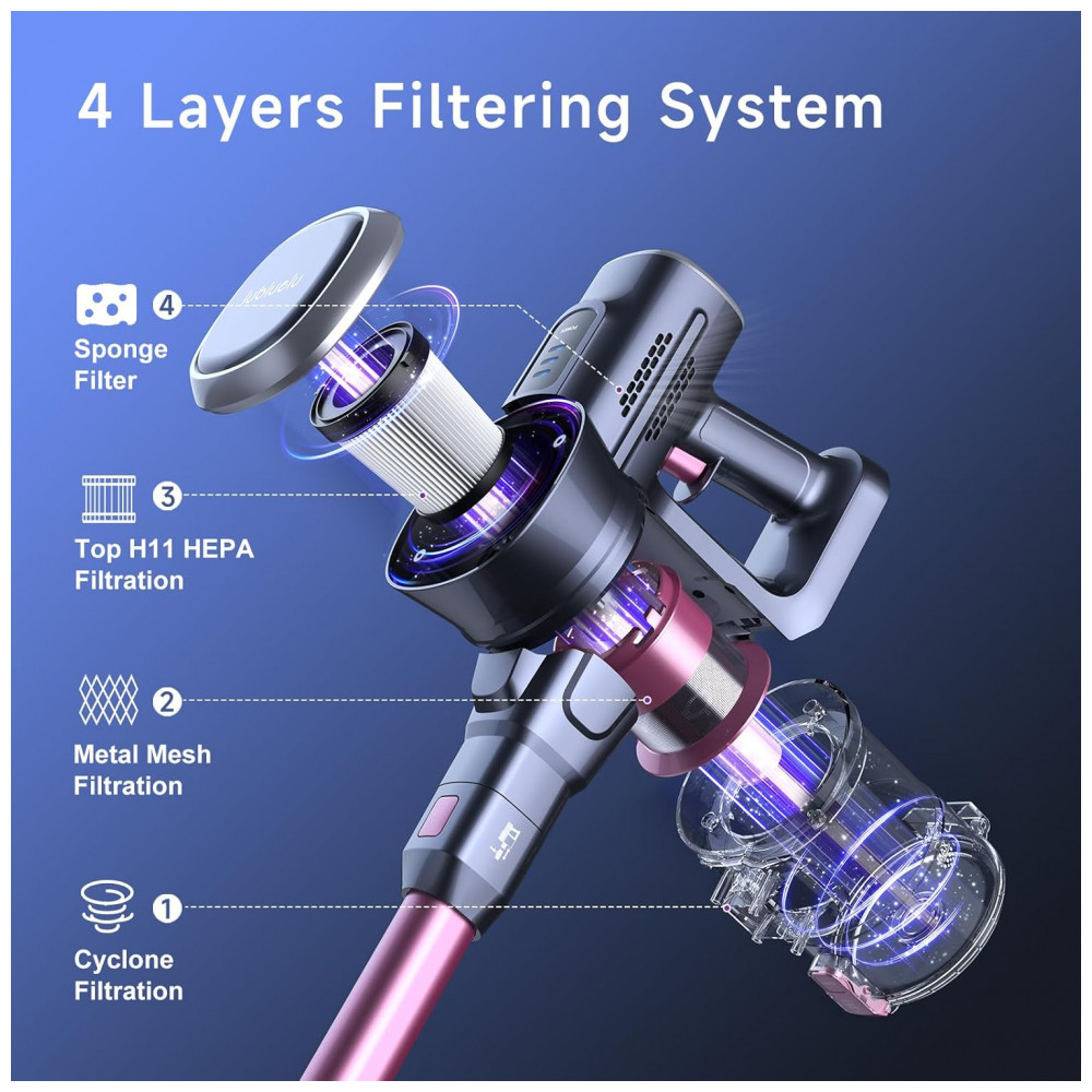 O aspirador sem fio Lubluelu GX-202CR-US equipa motor brushless de 235W com sucção máxima de 25 kPa em 3 modos ajustáveis (10 kPa mínimo, 17 kPa médio, 25 kPa máximo) para remoção eficiente de detritos, poeira e pelos em pisos rígidos, carpetes de baixa pilha, sofás e escadas. Cabeça de escova LED flexível com rotação lateral de 160° e vertical de 90° ilumina áreas escuras sob móveis, combinada a design autoestável que permite posicionamento independente sem suportes de parede. Sistema de filtração selado em 4 etapas inclui ciclone, malha de aço, HEPA e esponja laváveis, mantendo fluxo de ar constante no tanque de 600 ml com esvaziamento rápido.