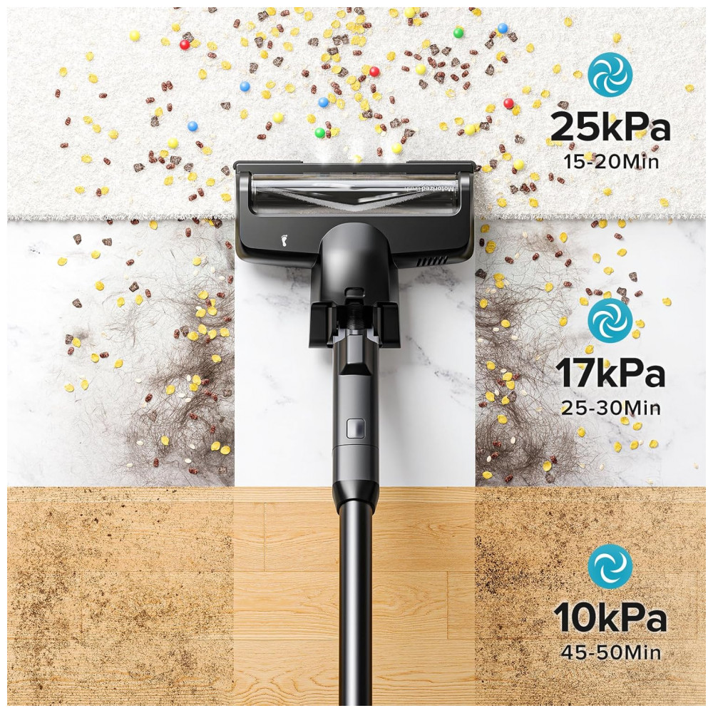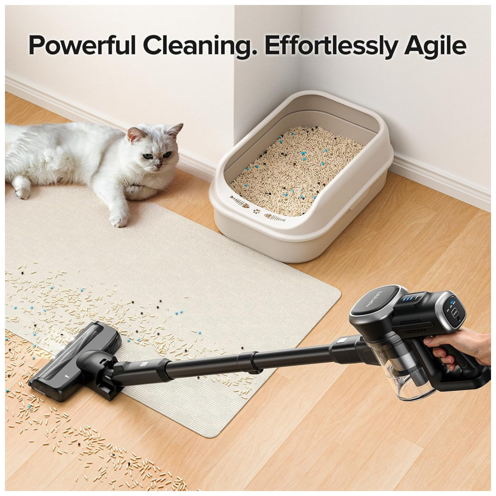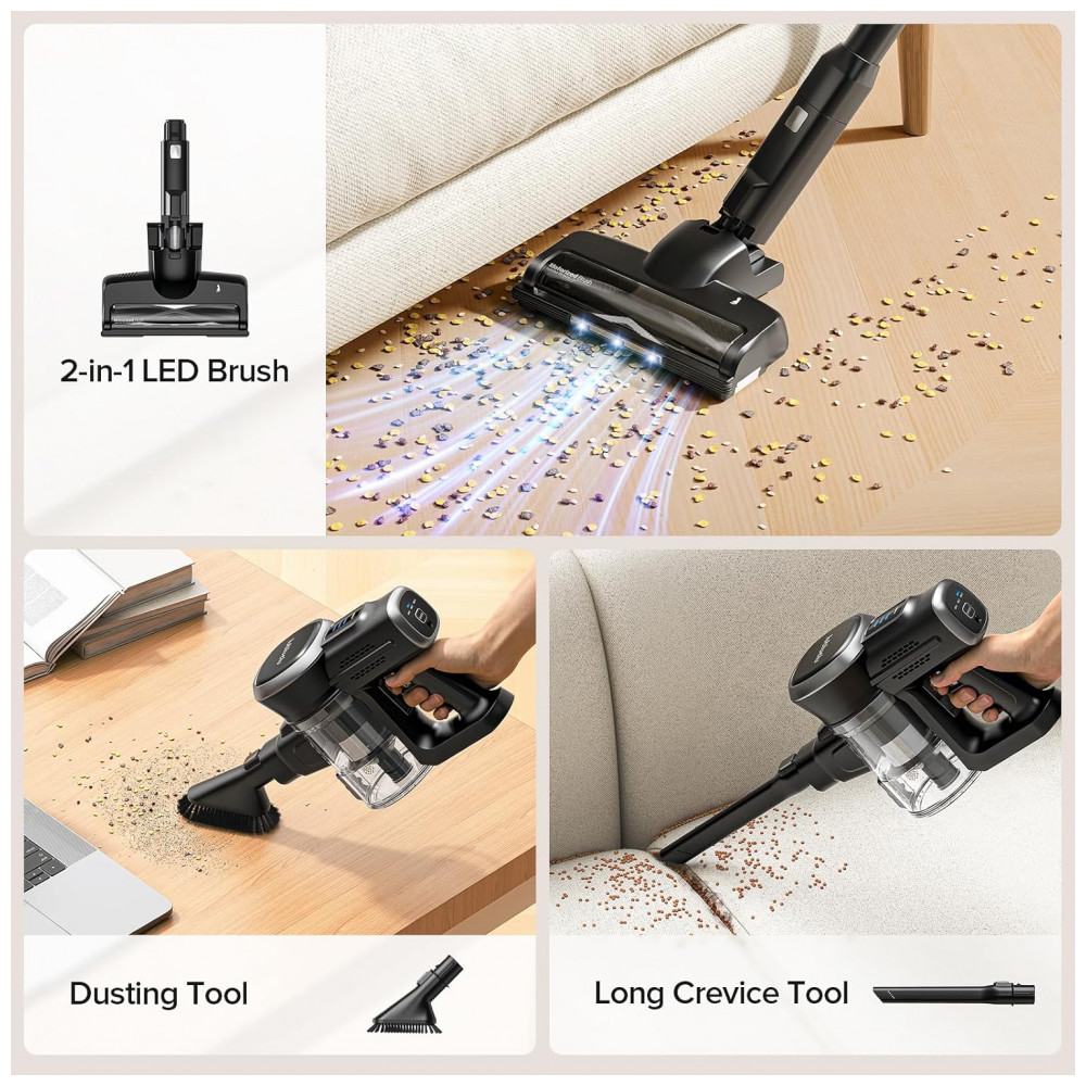 O aspirador sem fio Lubluelu LU-202-BK-US oferece 3 modos de sucção ajustáveis (10 kPa mínimo por 50 minutos, 17 kPa médio por 30 minutos, 25 kPa máximo por 12 minutos) com bateria removível para carregamento direto ou independente, otimizando limpeza em pisos rígidos, carpetes e pelos de animais. Design autoestável elimina necessidade de suportes murais, com cabeça de escova flexível de 160° lateral e 90° vertical equipada com 3 LEDs para iluminação de áreas escuras sob móveis e cantos. Tela touch integrada monitora status da bateria e modo operacional, combinada a tanque de 0,6 L com esvaziamento rápido e sistema de filtração HEPA selado para fluxo de ar constante.