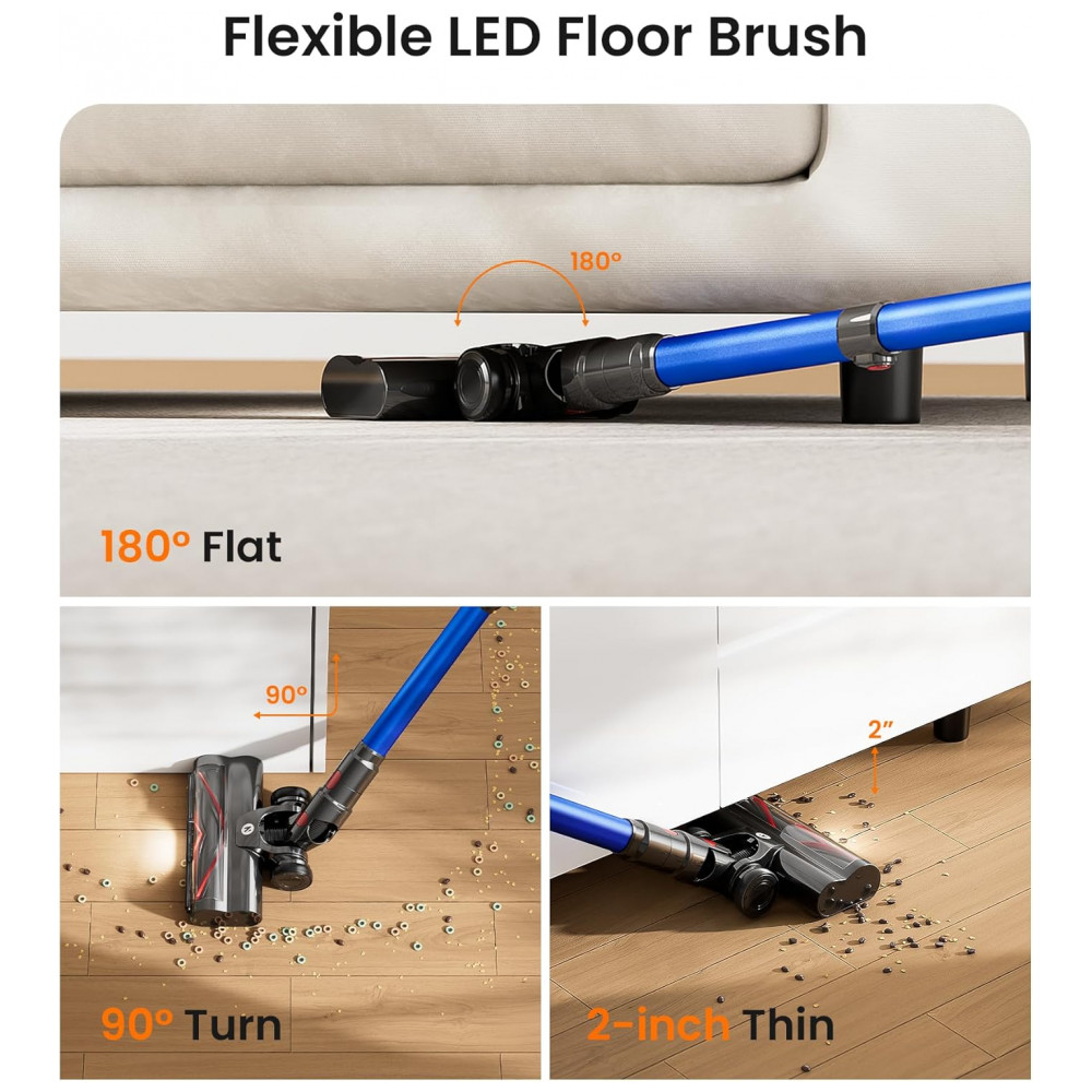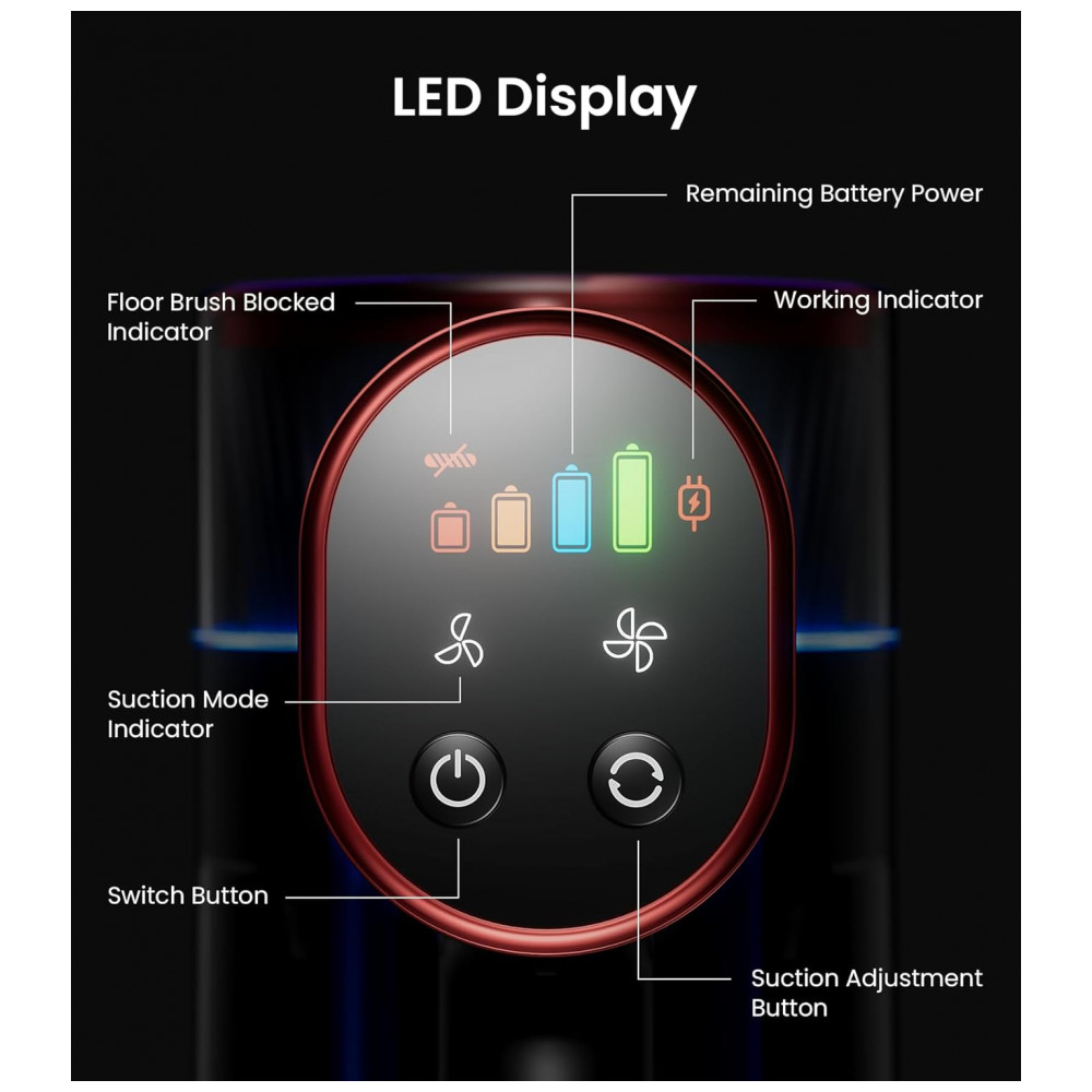 Sistema de filtragem HEPA de 5 estágios captura partículas finas. Escova rotativa em V para pisos duros e carpetes. Display LED de alta definição para monitoramento em tempo real.