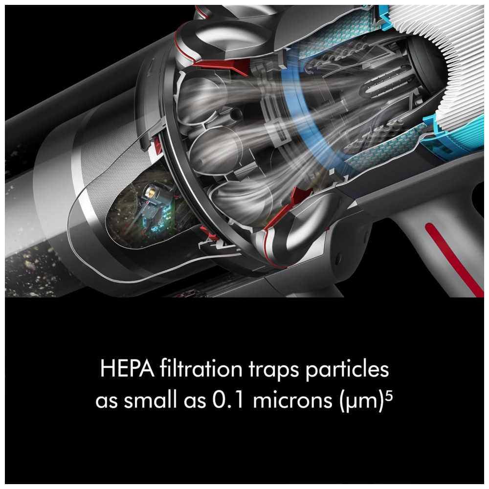 A estrutura utiliza materiais plásticos de engenharia na cor níquel/azul, com acabamento stick portátil e alça única. O sistema bagless permite esvaziamento higiênico, enquanto o filtro HEPA lavável retém partículas em toda a máquina. A cabeça motorizada de-tangle remove fios longos e pelos de animais automaticamente durante a limpeza.