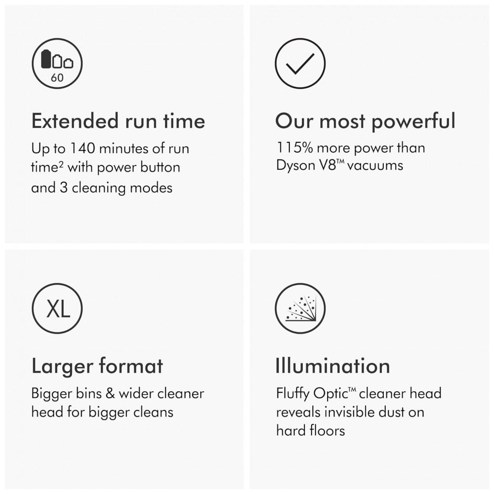 O aspirador vertical sem fio Dyson Gen5outsize oferece capacidade para limpeza profunda em todos os tipos de piso, com depósito XL de 86,9 cm, duas baterias de íons de lítio e motor digital de 0,469 CV. Inclui 3 modos de potência (Eco, Auto, Boost), tela LCD com alertas de manutenção e tempo restante, além de cabeças de limpeza Digital Motorbar XL e Fluffy Optic com iluminação para detecção de poeira. Projetado para uso interno em residências grandes, converte-se em aspirador de mão para estofados e escadas.