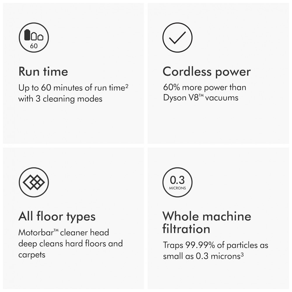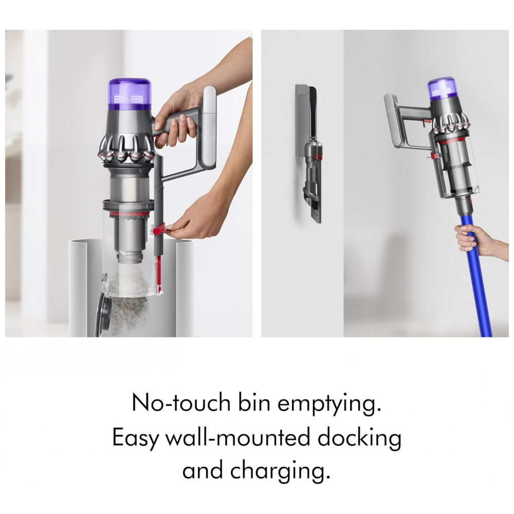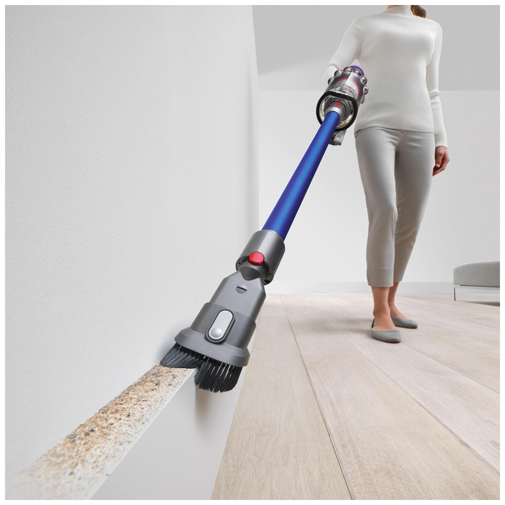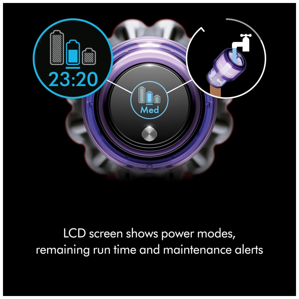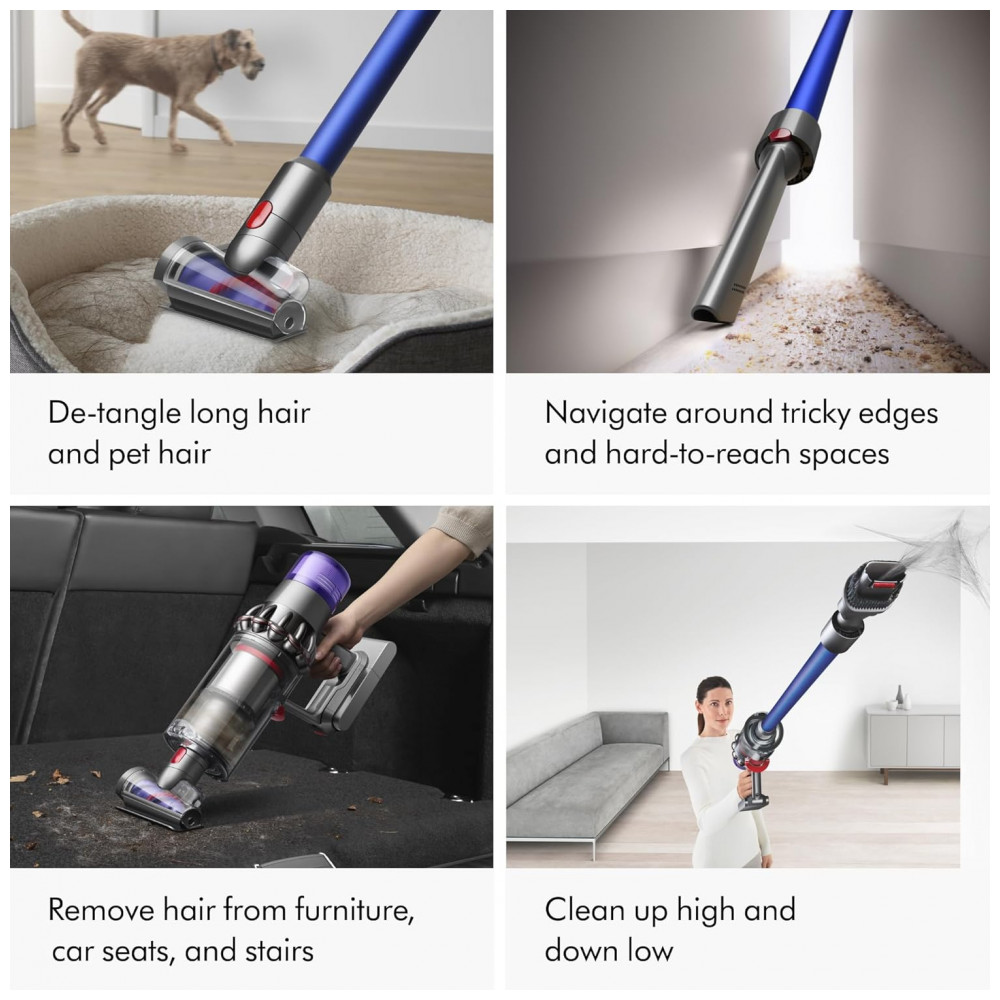 O aspirador vertical sem fio Dyson V11 foi projetado para limpeza completa de todos os tipos de piso em ambientes internos, com 3 modos de potência (Eco, Auto, Boost) e tela LCD que exibe modo atual, alertas de manutenção e tempo restante. Inclui cabeça Motorbar que limpa carpetes e pisos duros, removendo fios e pelos longos automaticamente, além de conversão para aspirador de mão para estofados, escadas e veículos. Opera com bateria de íons de lítio por até 60 minutos, sistema bagless e filtro lavável tipo disco.